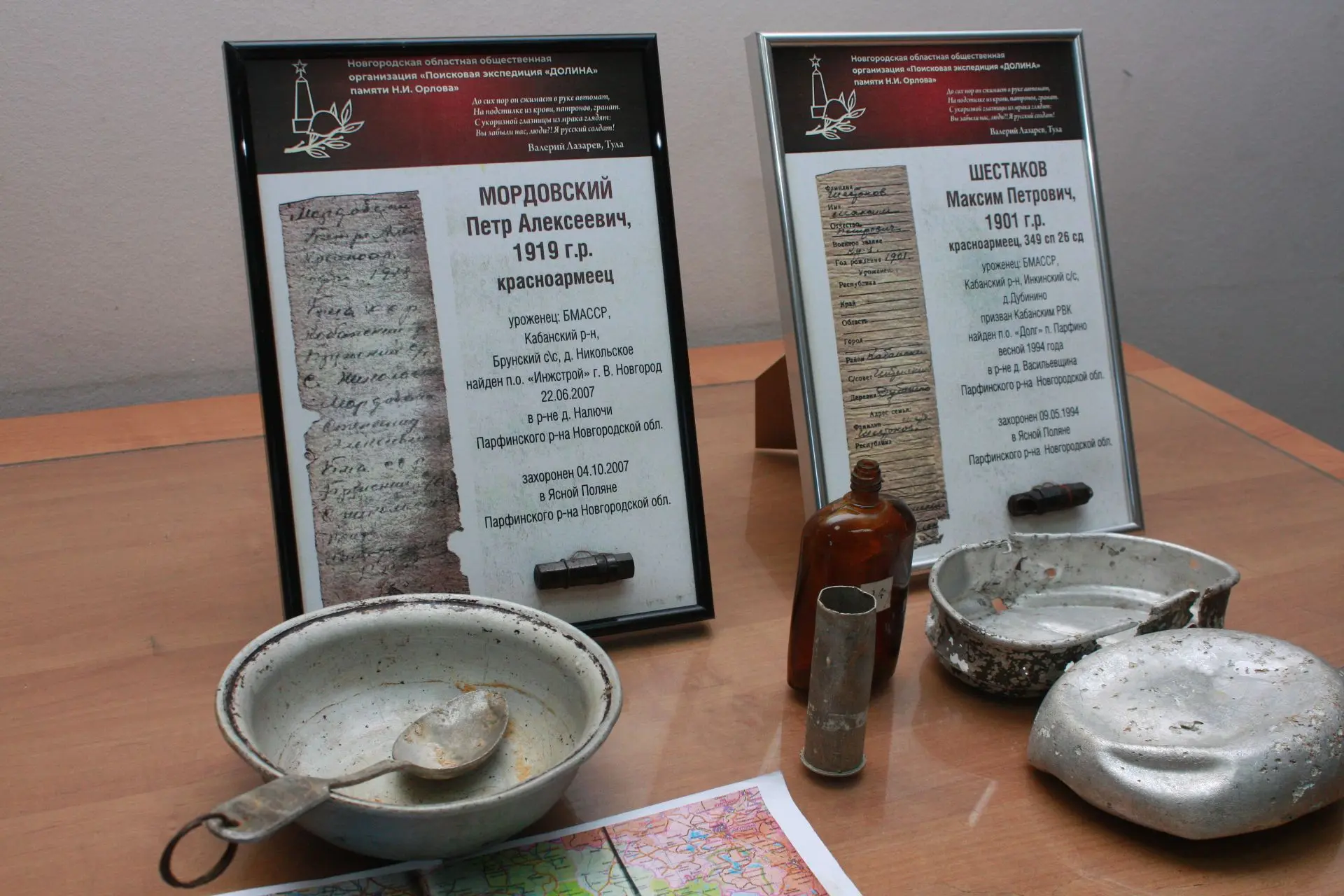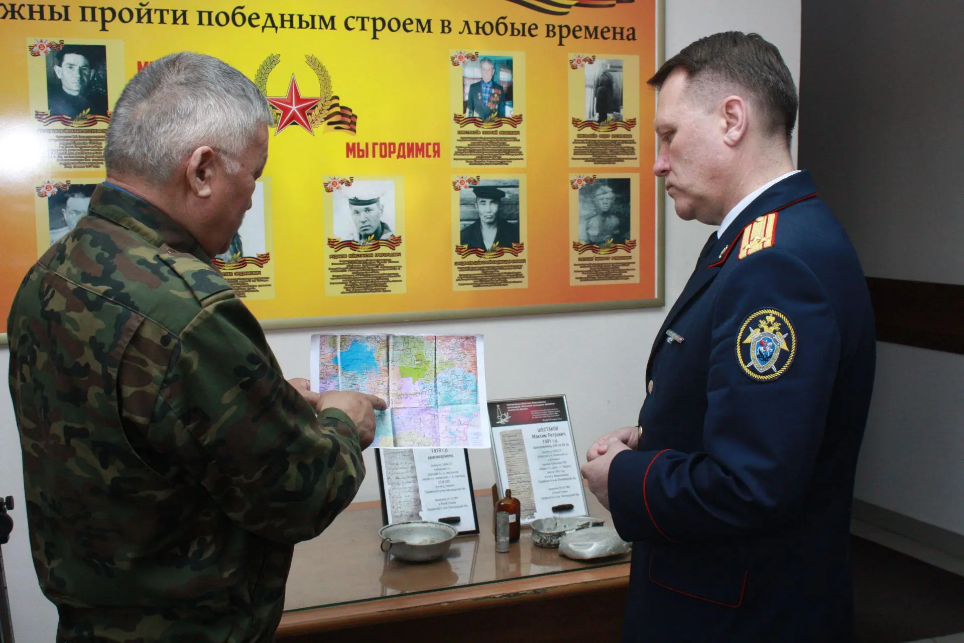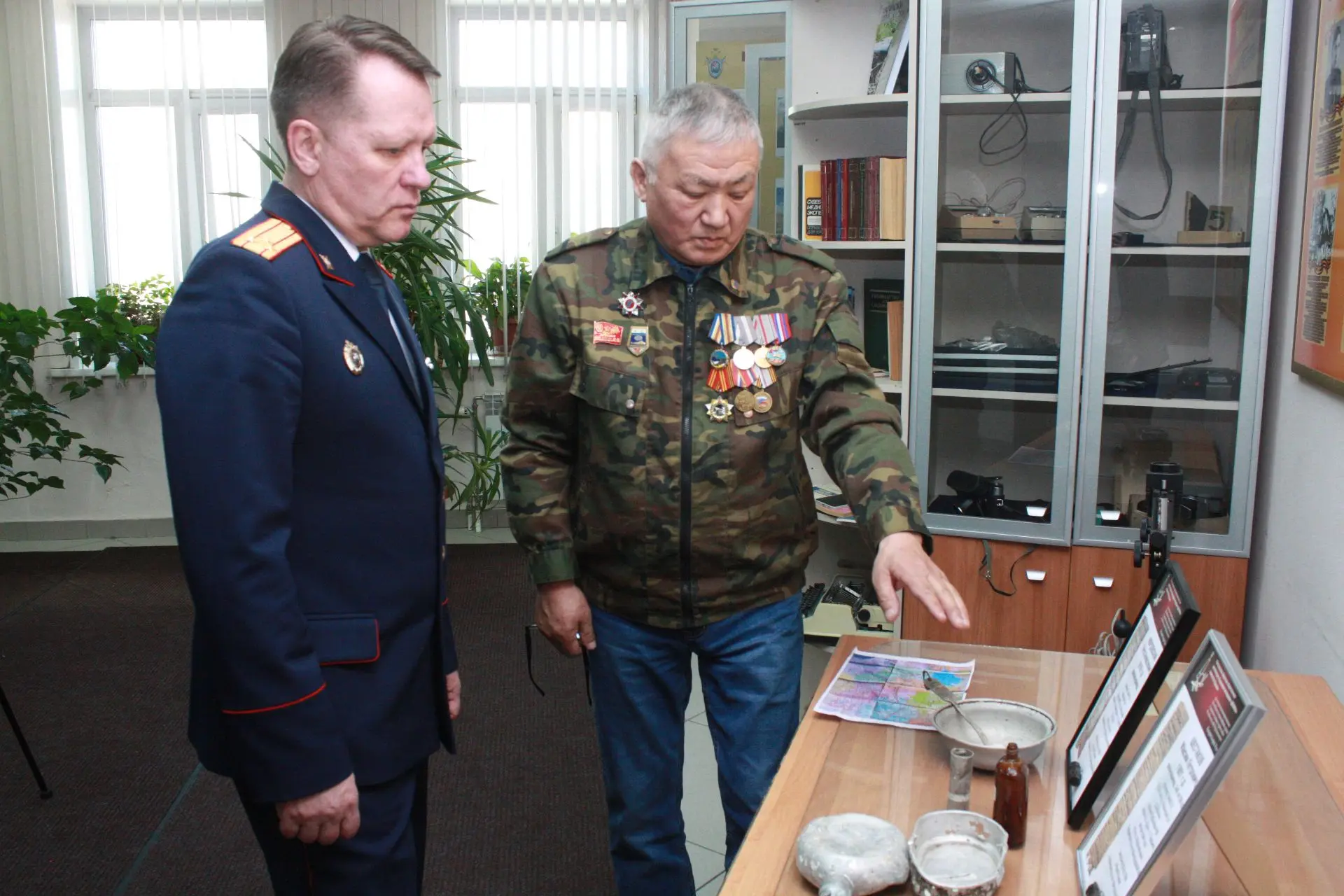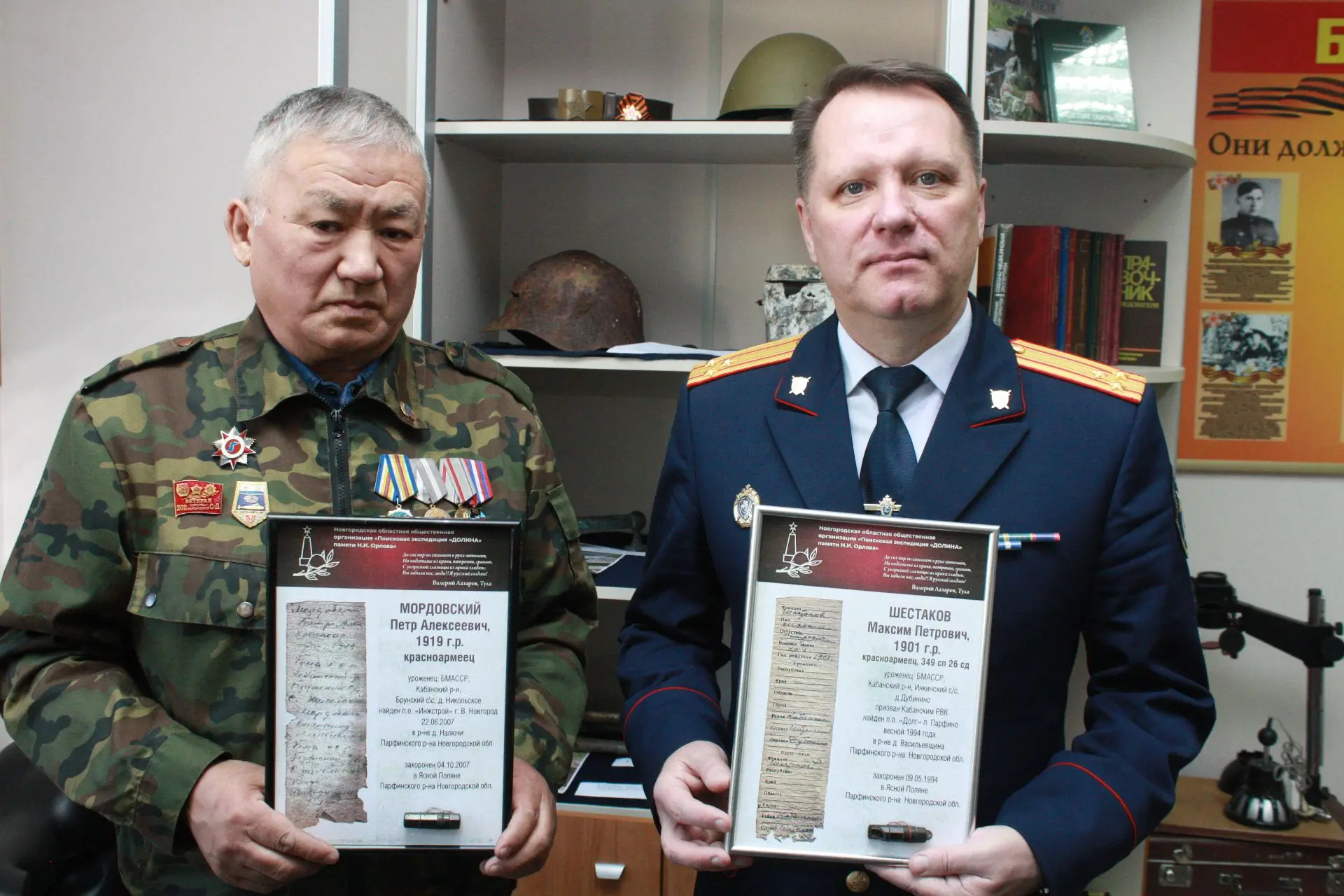 Недавно сотрудники следственного управления оказали волонтеру помощь в организации очередной поездки в Новгородскую область, откуда Баир Батодалаевич привез солдатские смертные медальоны, найденные во время поисковых работ, с расшифрованными данными погибших бойцов, которые были призваны на фронт из Бурятии. Эти медальоны представляли собой небольшой футляр (капсулу) с бумажным вкладышем, где солдаты своей рукой вписывали личные данные, по которым их могли опознать в случае гибели. Два из привезенных медальонов волонтер передал в музей следственного управления вместе с некоторыми личными вещами бойцов – солдатским котелком, ложкой и другими предметами. Во время беседы гость рассказал историю кровопролитных боев, прошедших на тех рубежах, где были обнаружены указанные медальоны, о зверствах фашистских захватчиков, совершенных в том числе в отношении мирного населения. Все больше и больше таких фактов устанавливают участники поискового движения во время своей работы на оккупированных врагами территориях.