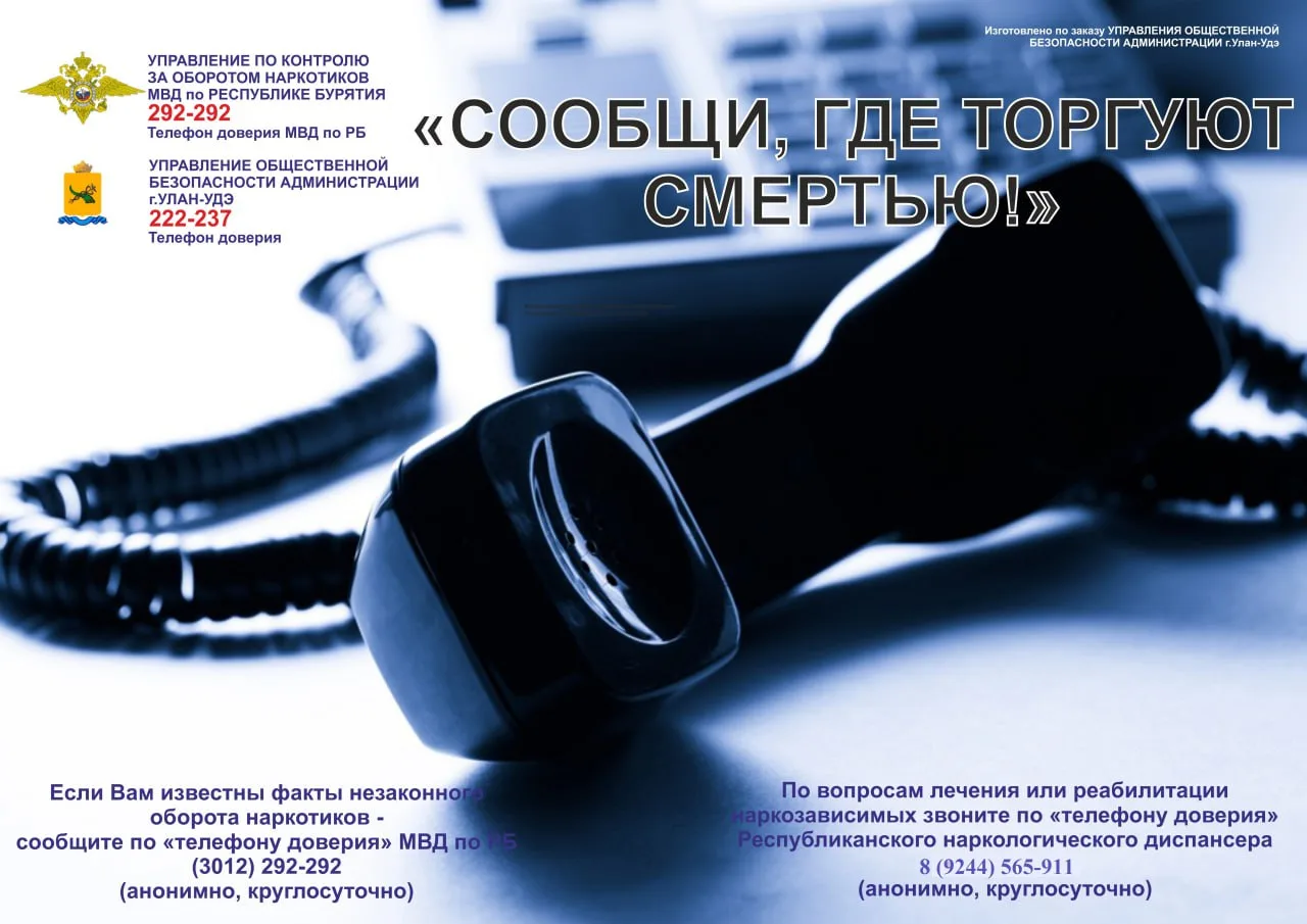 МВД по Республике Бурятия призывает жителей и гостей региона принять активное участие в акции. сообщить о местах продажи наркотических средств, запрещенных веществ, наркопритонах и местонахождении торговцев запрещенными веществами можно круглосуточно по телефонам 02 или 102 (с мобильного телефона) либо в ближайший отдел полиции.
