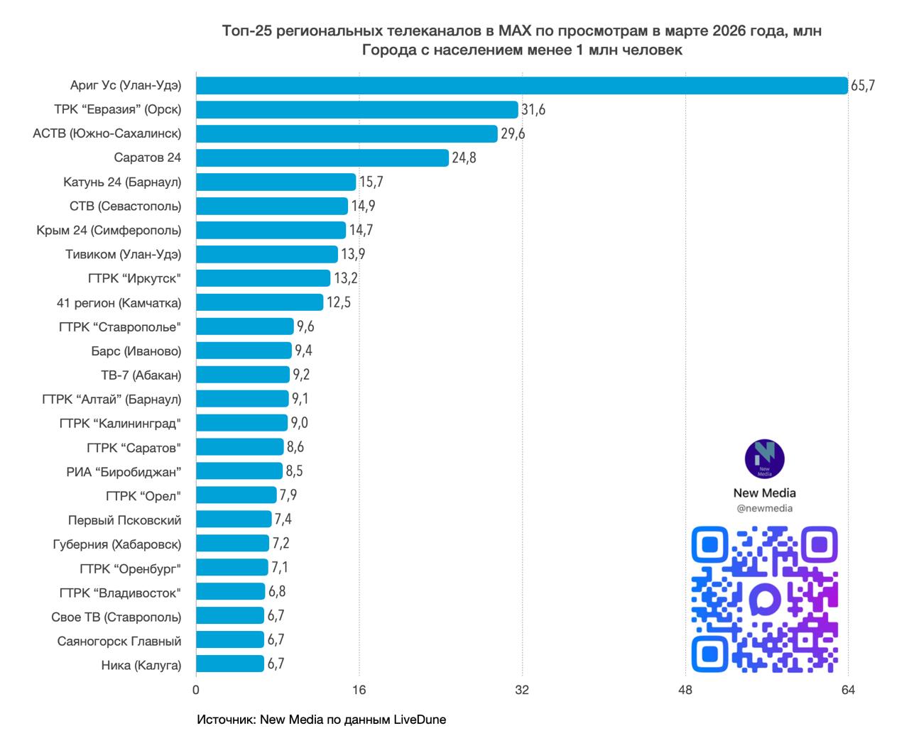 Топ-25 региональных телеканалов по просмотрам в MAX в марте 2026 года