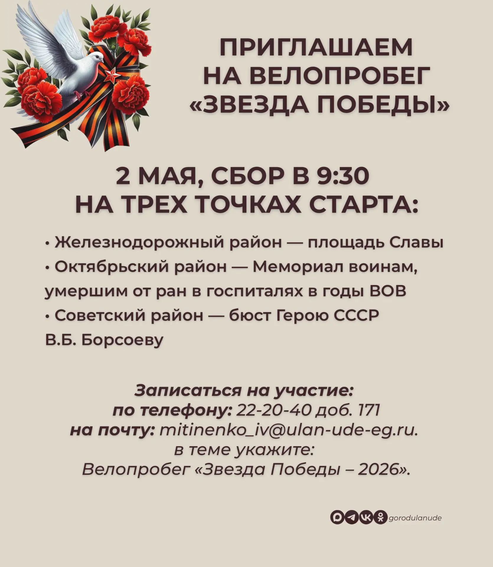 На велопробег «Звезда Победы», который состоится 2 мая, приглашаем жителей города в возрасте от 16 лет и старше.