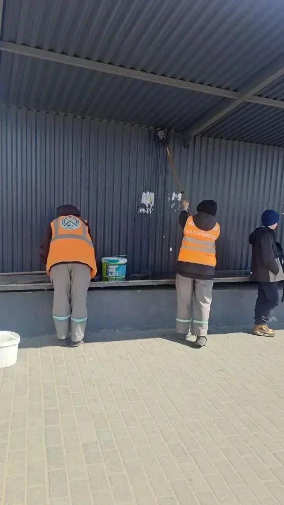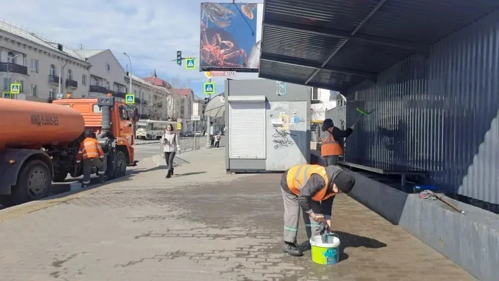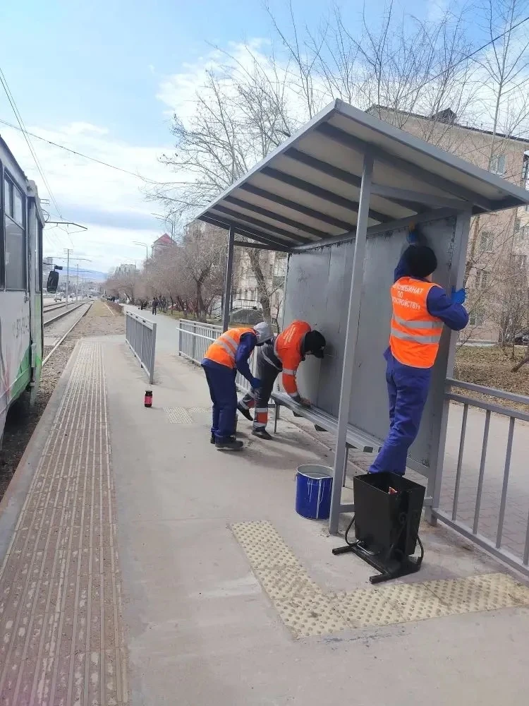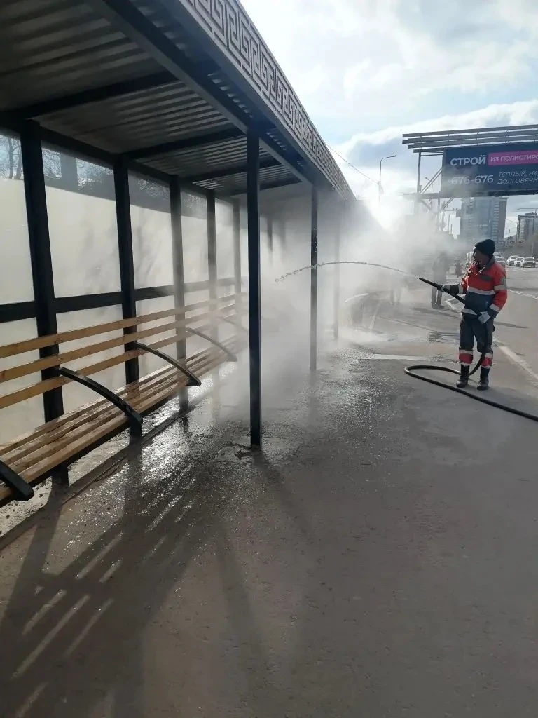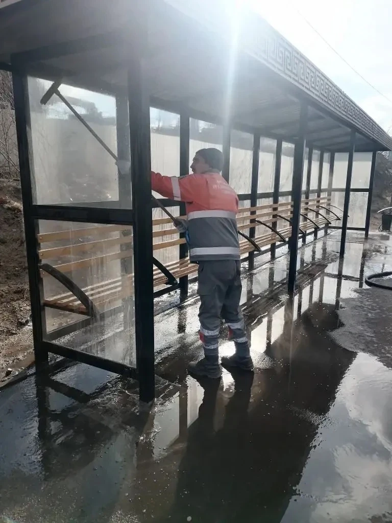 Генеральная уборка в городе идет полным ходом. Трамвайные и автобусные остановки «принимают» «горячий душ» после зимы. Уборщики Комбината по благоустройству также вручную вытирают лавочки, стены и крыши остановок, в также информационные щиты.