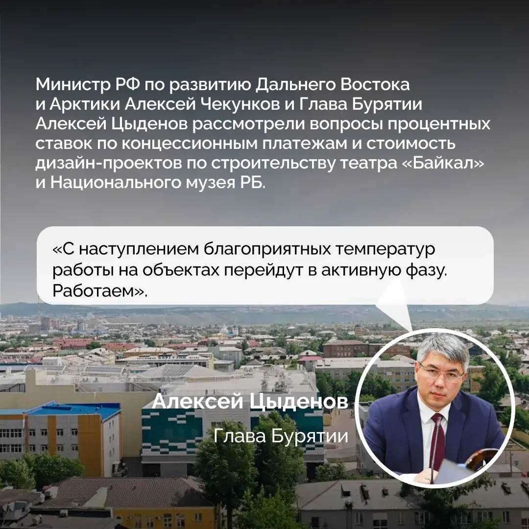 С министром РФ по развитию Дальнего Востока и Арктики Алексеем Чекунковым он обсудил реализацию концессионных соглашений по строительству театра «Байкал» и Национального музея. С замминистра образования и науки России Айратом Гатиятовым глава республики проработал текущие вопросы по строительству межвузовского кампуса.