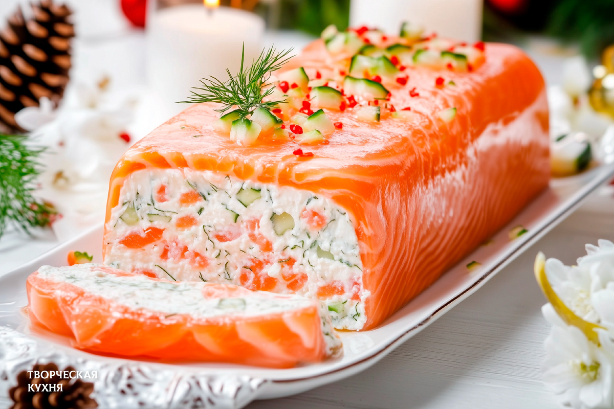 Дно формы для запекания застилается пищевой пленкой — она поможет легко извлечь террин после охлаждения. Затем укладываются нежные слайсы красной рыбы, оставляя края свисать. На них равномерно распределяется готовая начинка, которая слегка утрамбовывается. Свисающие краешки закрываются сверху, а форма оборачивается пленкой и ставится в холодильник минимум на 4 часа (оптимально — на ночь).