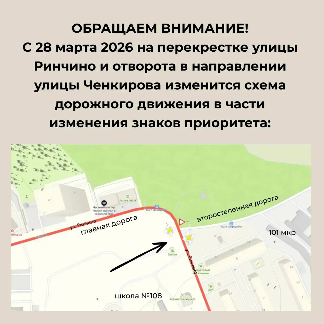Движение автотранспорта по ул. Ринчино в направлении школы №108 и обратно будет осуществляться по главной дороге;