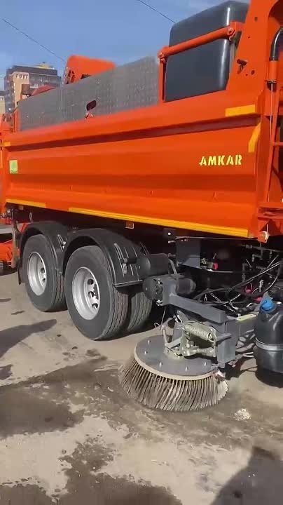 На новом КАМАЗе нужен только водитель. Две малые щётки сметают песок и мусор к центру автомобиля, а большая направляет их на транспортёр, после - в кузов самосвала.
