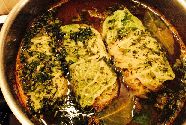 Вынимаем кочерыжки из двух кочанов капусты и кипятим воду в большой кастрюле. Кочаны опускаем в кипяток на 1,5–2 минуты, снимая размягченные листья. Вам потребуется 15–20 самых крупных и сочных листьев, а оставшуюся капусту можно заквасить на зиму.