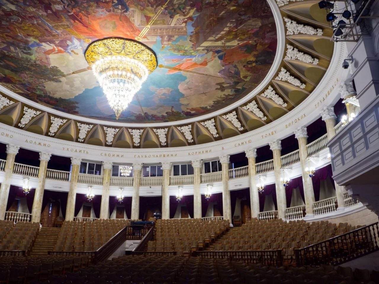 Композиция «Торжество социалистического строя», украшающая плафон зала, создана художниками Георгием Рублевым и Борисом Иорданским. Роспись выполнена в технике русской темперы, работы над ней велись в течение трех лет. На ней можно увидеть Лхасарана Линховоина, Надежду Петрову и других деятелей культуры и искусства Бурятии.