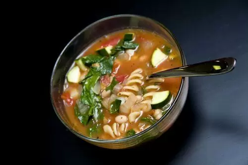 - Добавление томатов и пасты: Затем добавьте очищенные от кожуры и семян томаты и дайте готовиться еще 10 минут. Опустите в суп пасту и варите до готовности.