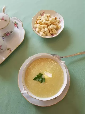 Готовое суп-пюре следует разлить в порционные тарелки, добавить по кусочку сливочного масла и украсить свежими листьями петрушки. К этому замечательному блюду подойдут сухарики из кукурузного батона как гарнир. Приятного аппетита!