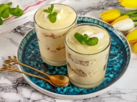 Когда крем и тесто охладятся, можно начинать сборку десерта. В стаканы на дно выложить пару столовых ложек приготовленного крема, затем раскрошить остывшее тесто или печенье, создавая слои. Продолжать чередовать крем и крошку до заполнения стакана. В конце поместить десерт в холодильник хотя бы на 30 минут. Перед подачей украсить свежей мятой и предложить к чашечке ароматного чая.