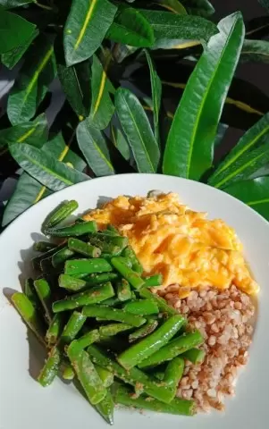 - Скрэмбл с гречкой и стручковой фасолью. Простое, но сытное блюдо поможет разнообразить утро.