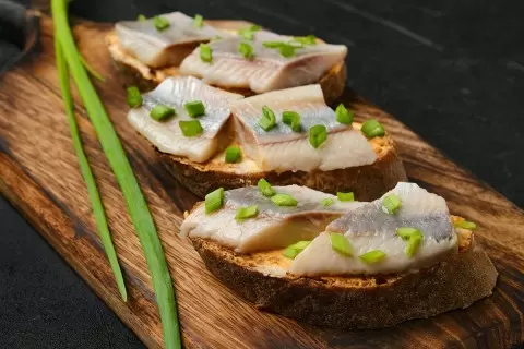 • Канапе с соленой сельдью: Нежные кусочки бородинского хлеба, намазанные горчицей и topped с соленой сельдью, создадут идеальное сочетание вкусов. Дополнить блюдо можно перьями зеленого лука.