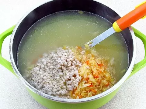 2. Варка бульона: В большую кастрюлю на 5 литров помещаются подготовленные куски свинины, квашеная капуста и перловая крупа. Заливаем всё холодной водой и ставим на огонь, не забывая убирать образующуюся пену. После закипания убавляем огонь и варим около двух часов, чтобы мясо стало мягким, а бульон насыщенным.