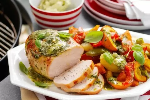 Первым этапом станет маринование мяса. Для этого смешивают оливковое масло, измельчённый чеснок, специи и оставляют индейку мариноваться минимум на 30 минут в холодильнике. После этого переходим к подготовке овощей: картофель нарезаем крупно, перец — полосками, а лук — полукольцами. Все нарезанные овощи следует заправить маслом и специями.