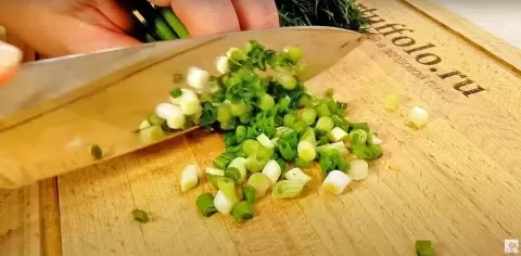 Подготовьте свежую зелень, нарезав мелко зеленый лук и укроп — они придадут начинке особый аромат.