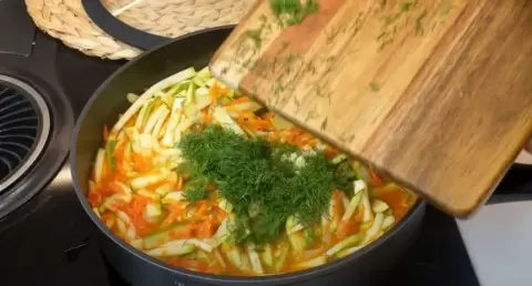 После этого добавляем подготовленные кабачки, тщательно все перемешиваем и накрываем крышкой. Тушите на небольшом огне 7-10 минут. В конце стоит попробовать на соль и при необходимости подсолить, добавляя оставшиеся измельченные зубчики чеснока и рубленую зелень. Все тщательно перемешать. Закуска готова и готова удивить вас своим аппетитным ароматом!