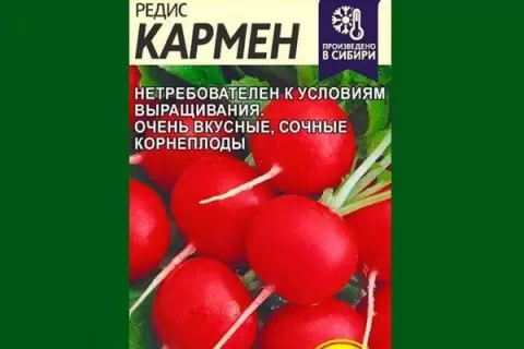 Редис Кармен отличается неоднозначностью: он имеет крепкий иммунитет, что позволяет избежать многочисленных заболеваний и атак вредителей. Этот сорт был выведен специалистами агрофирмы «Поиск» и стал доступен с 2006 года. Он подходит для культивирования в открытом грунте, сохраняя свои отменные товарные качества и вкус. Сочные корнеплоды можно собирать уже через 3-4 недели после посева, что делает его идеальным вариантом для быстрого получения урожая.