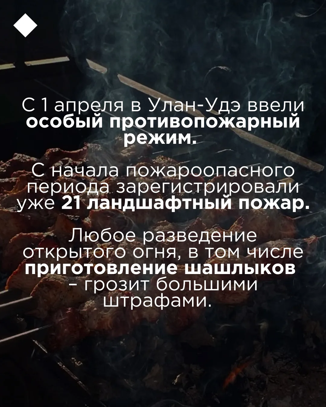 С 1 апреля в Улан-Удэ действует особый противопожарный режим. Наказывать будут даже просто за нахождение в лесу. А шашлыки жарить тем более нельзя.