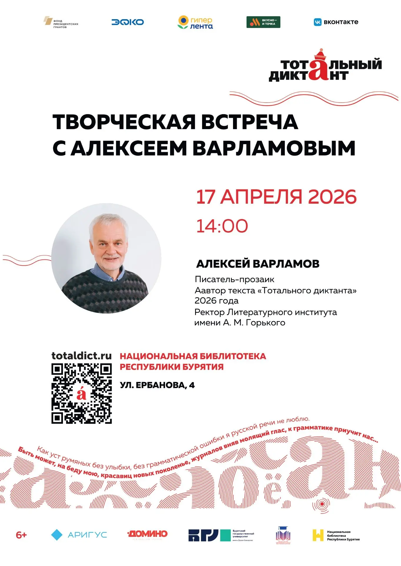 А уже 18 апреля Алексей Варламов зачитает текст «Тотального диктанта» в «Юрте у реки». Пройти регистрацию на его площадку можно тут: https://events.totaldict.ru/venues?cityId=73