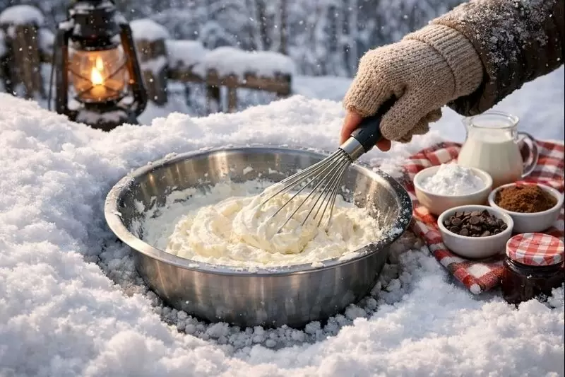 Есть несколько лайфхаков, которые помогут избежать холода: можно взбить смесь дома с помощью миксера, а на улице лишь охладить. Также рекомендуется предварительно охладить пустую миску в снегу, прежде чем добавлять ингредиенты.