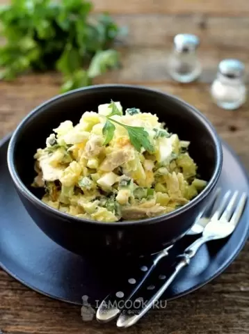 5. Финальный аккорд. Нарезанные яйца добавить в салат, посолить и поперчить по вкусу. Заправьте все щедрой ложкой майонеза и аккуратно перемешайте. В этом процессе важно не спешить, создавая настоящую кулинарную гармонию.