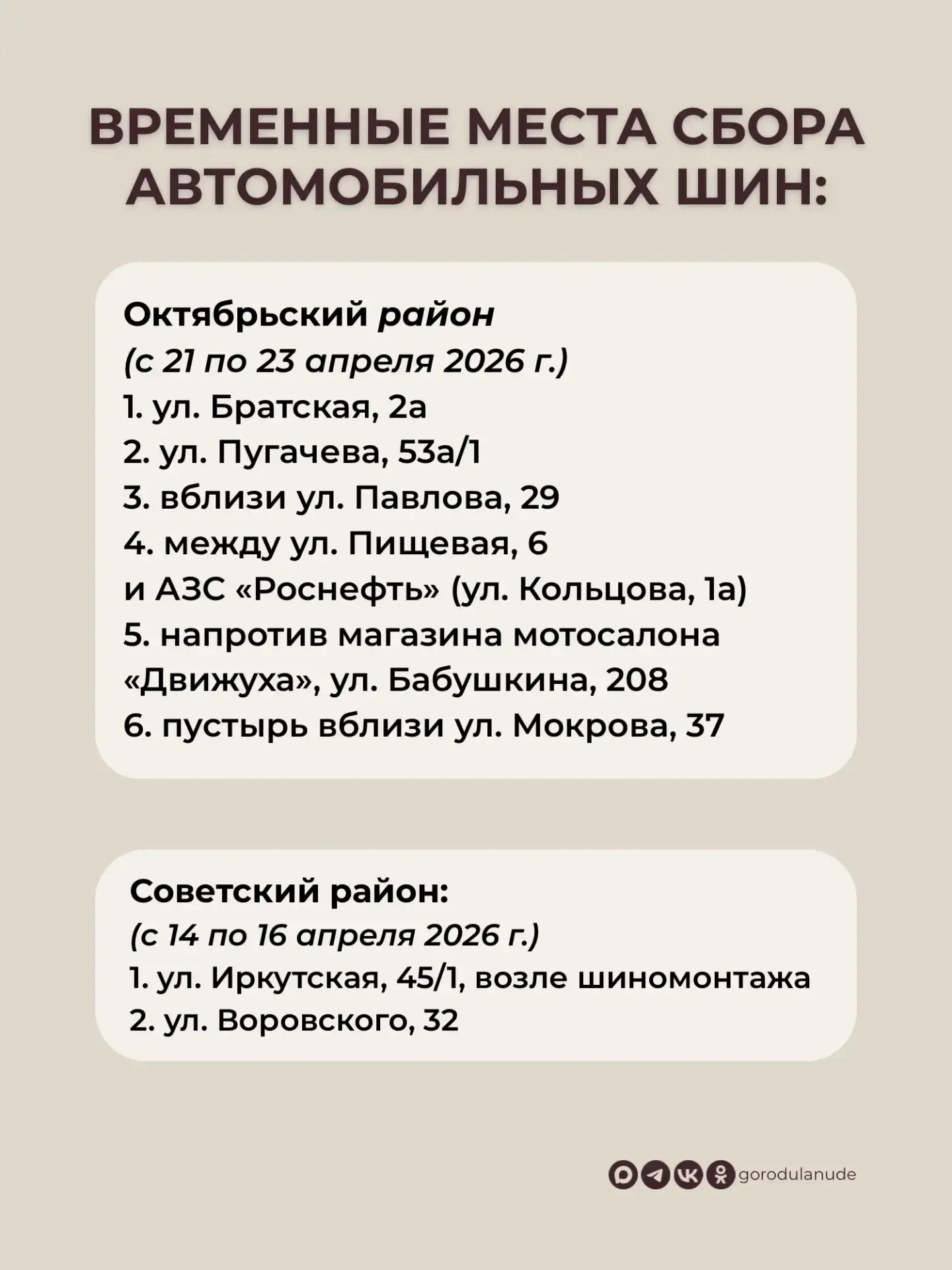Весенний месячник чистоты – отличный повод избавиться от старых шин. Сдайте ненужную «резину» на переработку. Из нее сделают безопасное покрытие для новых площадок.