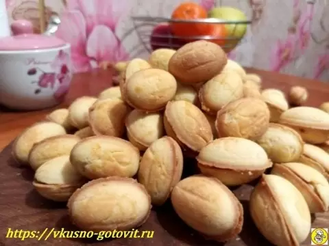 Тесто замешивают до рассыпчатой крошки, затем охлаждают, чтобы удобно разделять на порции. Формируются скорлупки, в которые кладётся начинка: сгущёнка с ореховой крошкой. В процессе выпечки половинки соединяют в орешек, а остальное тесто используют для следующих заготовок.