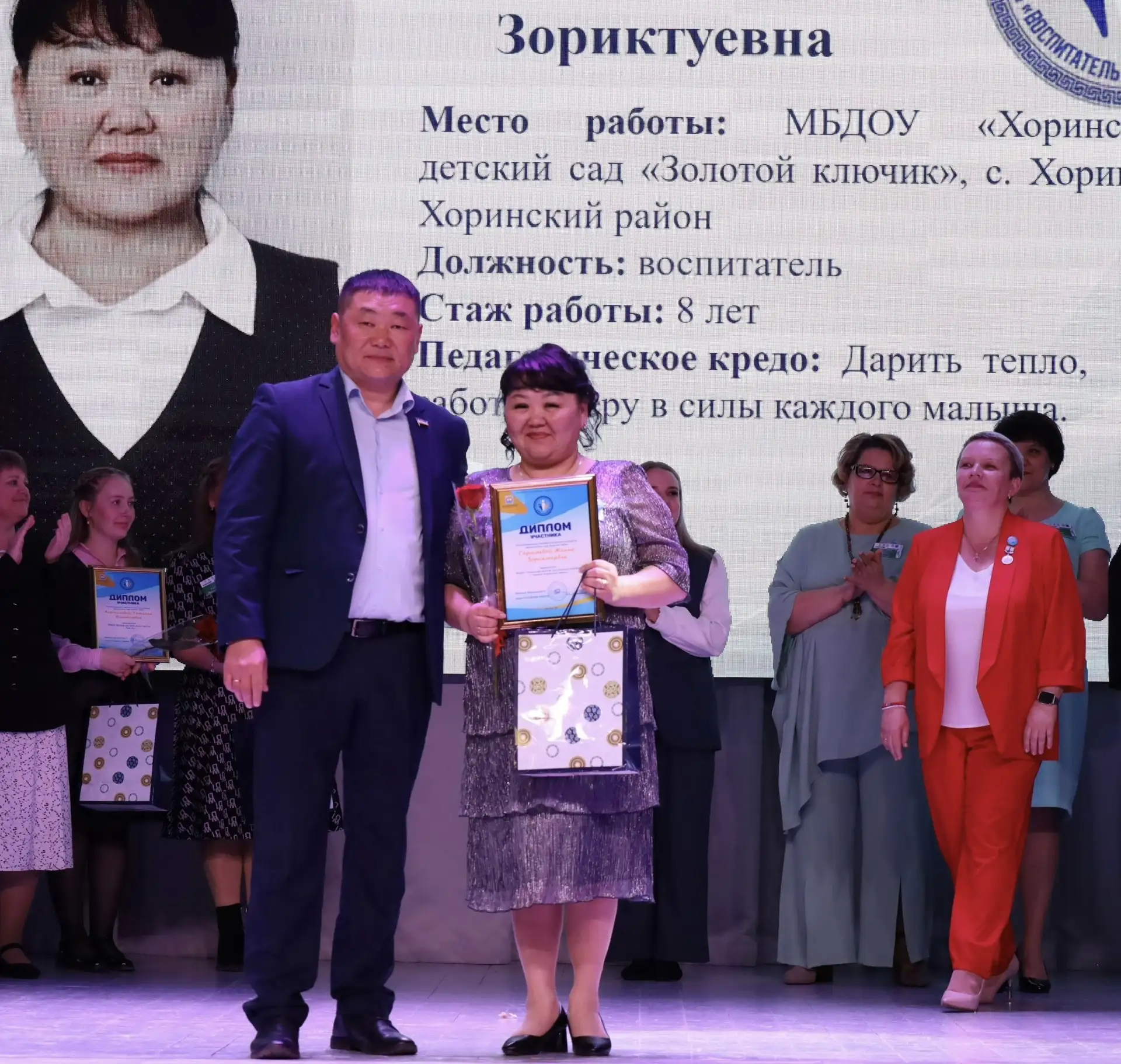 «Эти конкурсные дни стали для нас маленькой жизнью, наполненной яркими эмоциями, душевными разговорами, улыбками и, конечно же, волнением. Спасибо жюри, которые увидели наши добрые сердца и любовь к профессии воспитателя. Хочу поблагодарить организаторов конкурса за подаренный праздник профессионального мастерства, Управление образования Прибайкальского района – за веру в меня и поддержку, а также мой любимый детский сад "Росинка"», — сказала в своем выступлении победительница.