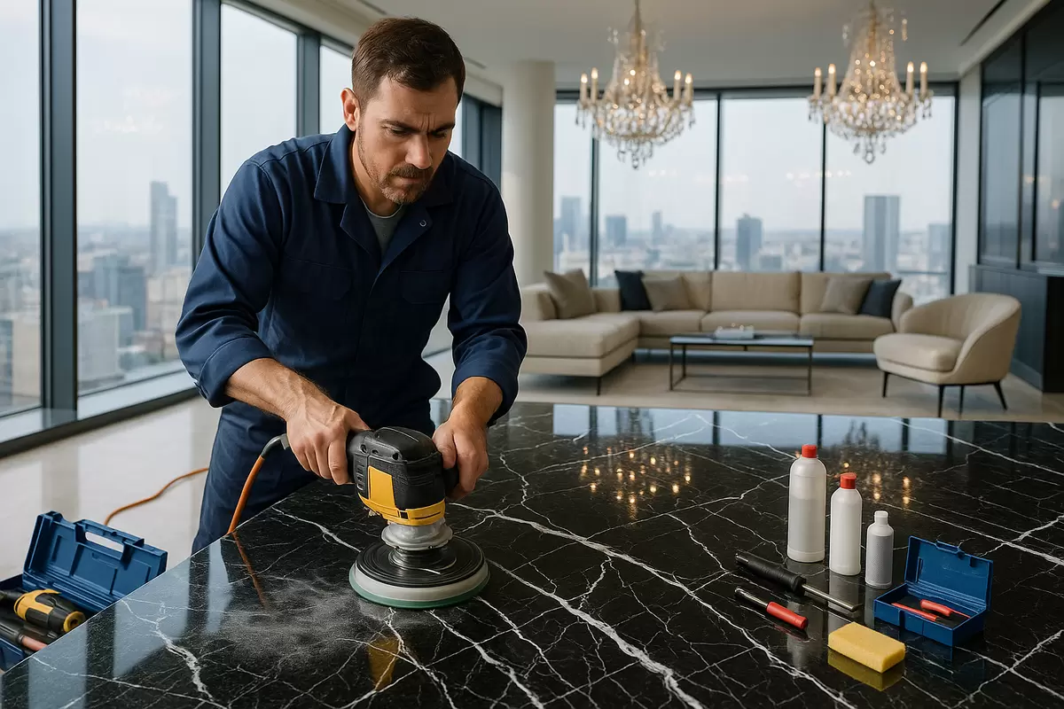 - Целевая обработка разводов: применяйте специальную пасту для мрамора или смесь пищевой соды с водой. Нанесите состав на пораженные участки и оставьте на 5-7 минут, затем удалите влажной тканью.