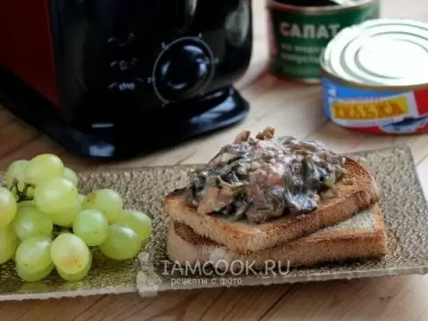 Переходим к самому интересному — сборке бутербродов! Можно использовать как белый, так и ржаной хлеб. Подсушенный хлеб сделает закуску ещё более вкусной. Наносим приготовленную смесь на кусочки хлеба, и всё — собственно, закуска готова к подаче!