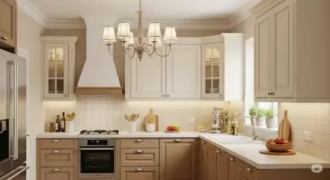 Кухня должна гармонично сочетать функциональность и атмосферу общения. Центральное освещение (люстра или подвесные лампы) должно создать мягкий и равномерный свет без резких теней. Зонирование с помощью светодиодных лент под шкафами обеспечит удобство при готовке, особенно в вечернее время. Рекомендуется выбирать лампы с температурой света около 3500-4000 К, чтобы естественные цвета продуктов были видимы.