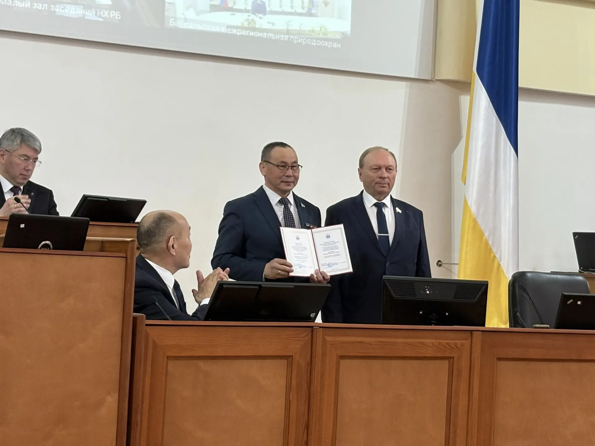 Руководитель парламента Владимир Павлов наградил депутата Жамбал-Жамсо Жанаева Почетной грамотой Народного Хурала Республики Бурятия за вклад в развитие республиканского законодательства и парламентаризма.