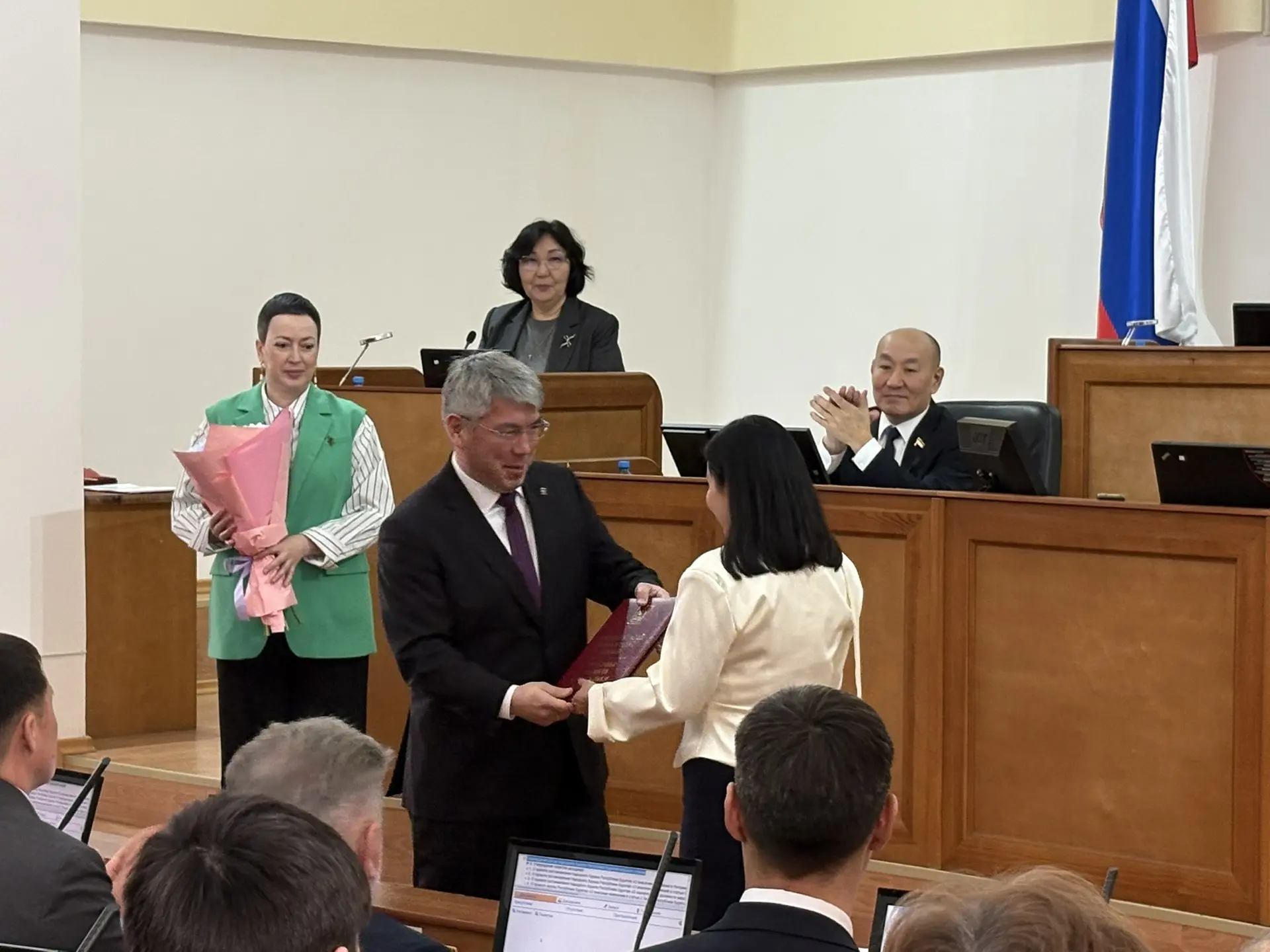 Глава Республики Бурятия Алексей Цыденов за большой вклад в развитие республиканского законодательства и парламентаризма Почетной грамотой Республики Бурятия наградил главного специалиста отдела Аппарата Народного Хурала Татьяну Дамдинову.