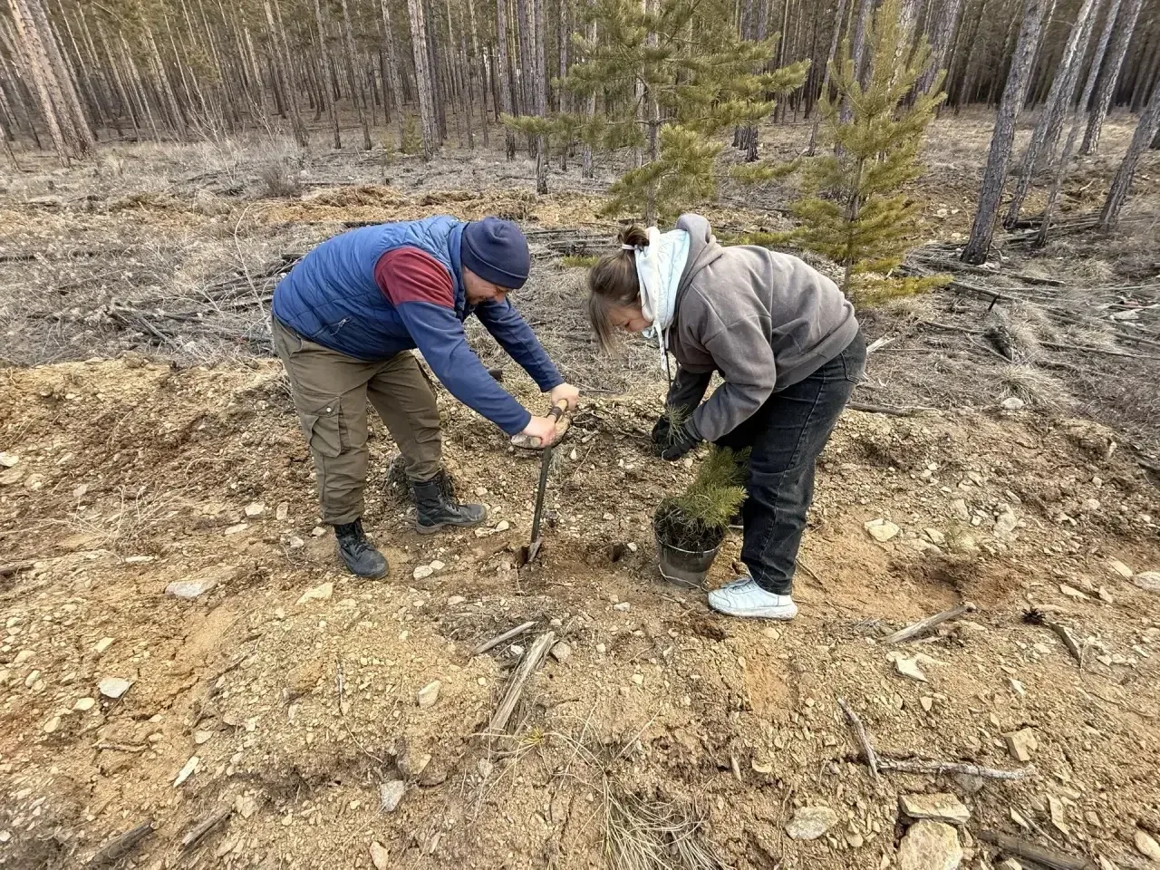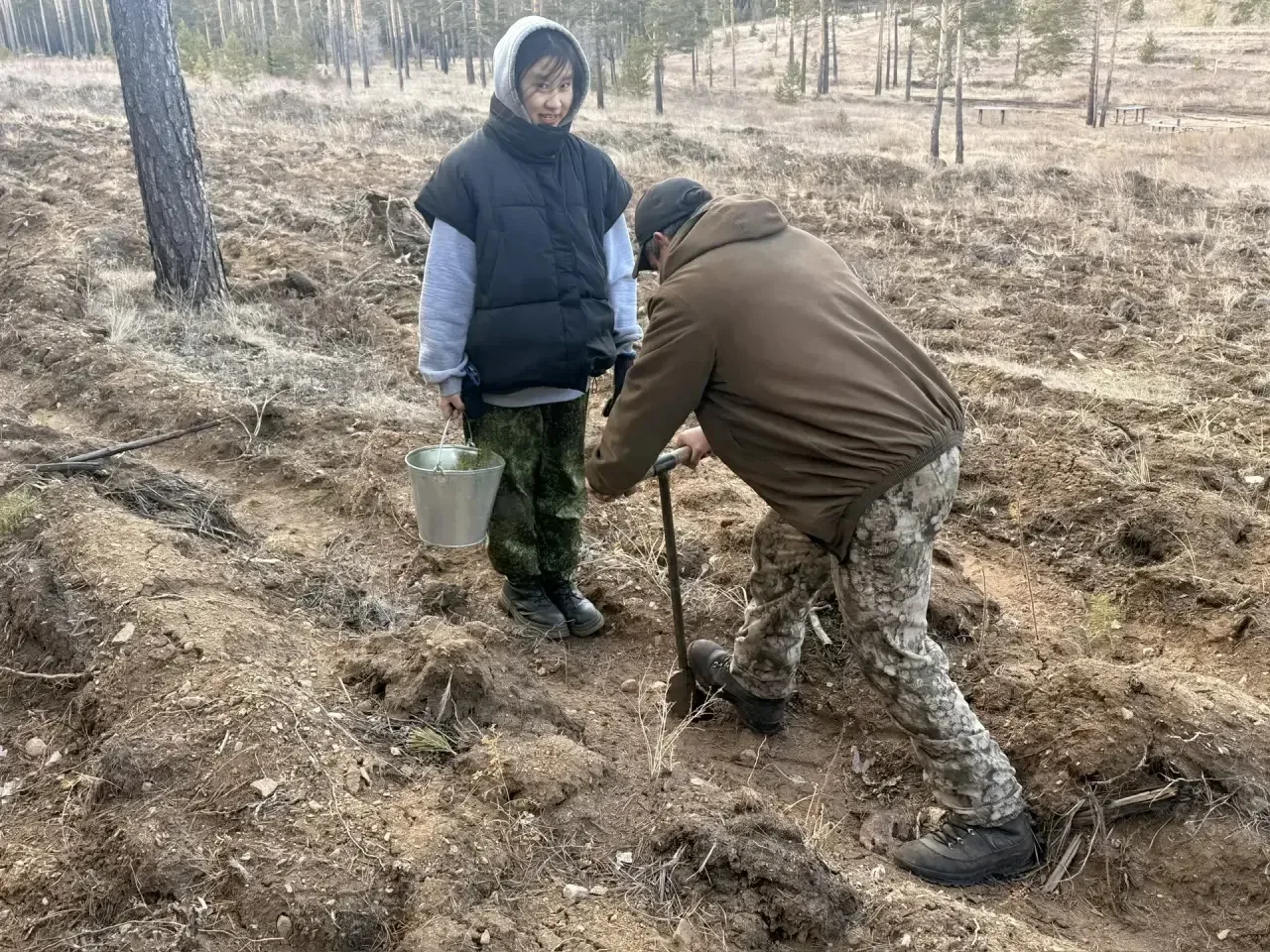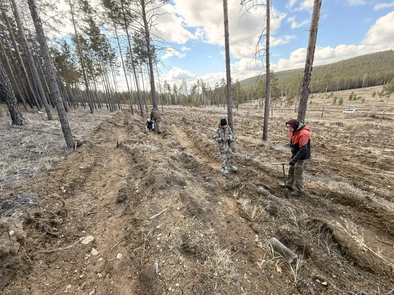 Помогали высаживать деревья студенты Бурятского колледжа технологии и лесопользования — они проходят здесь практику и учатся работать в лесу.