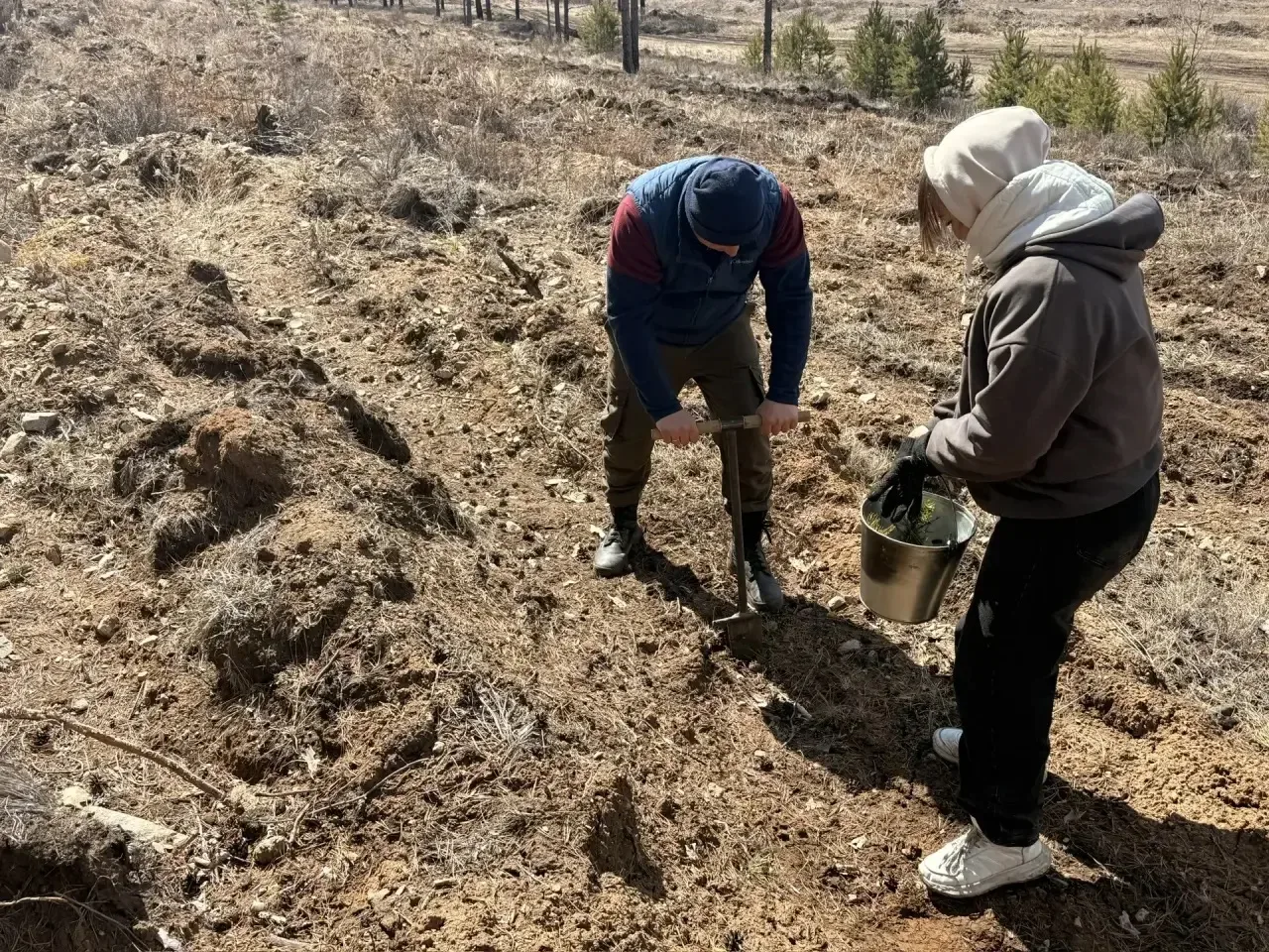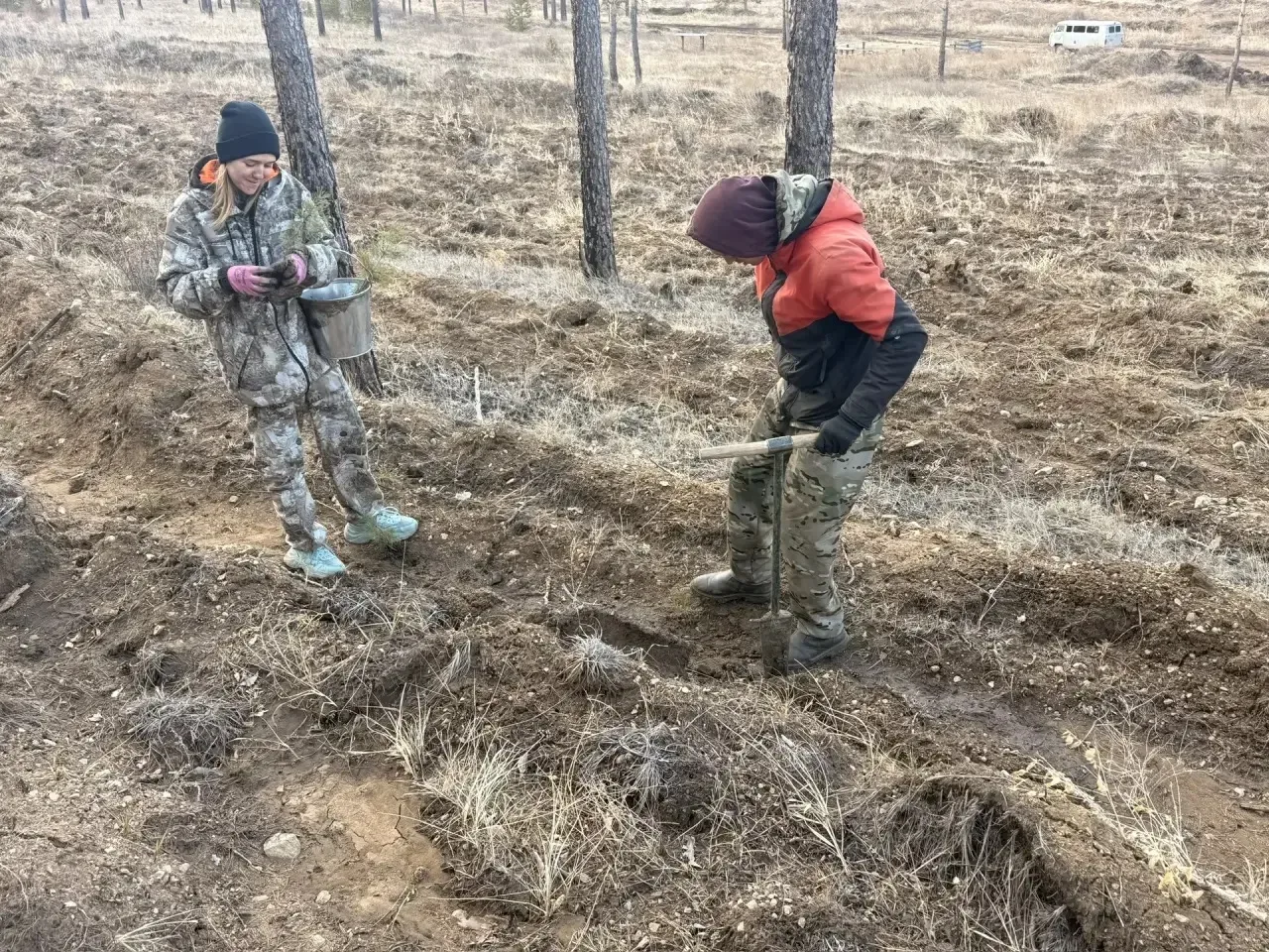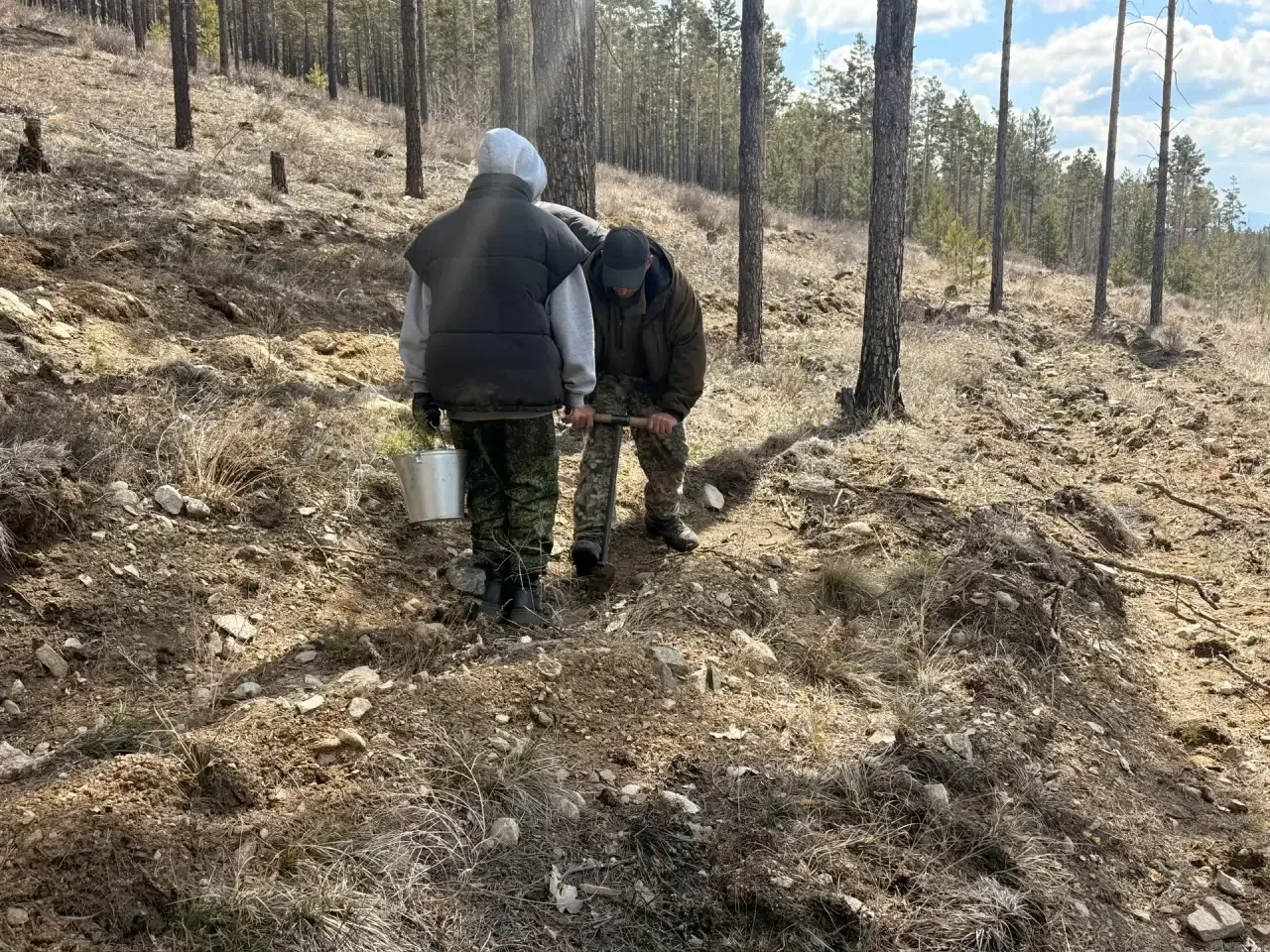 Помогали высаживать деревья студенты Бурятского колледжа технологии и лесопользования — они проходят здесь практику и учатся работать в лесу.