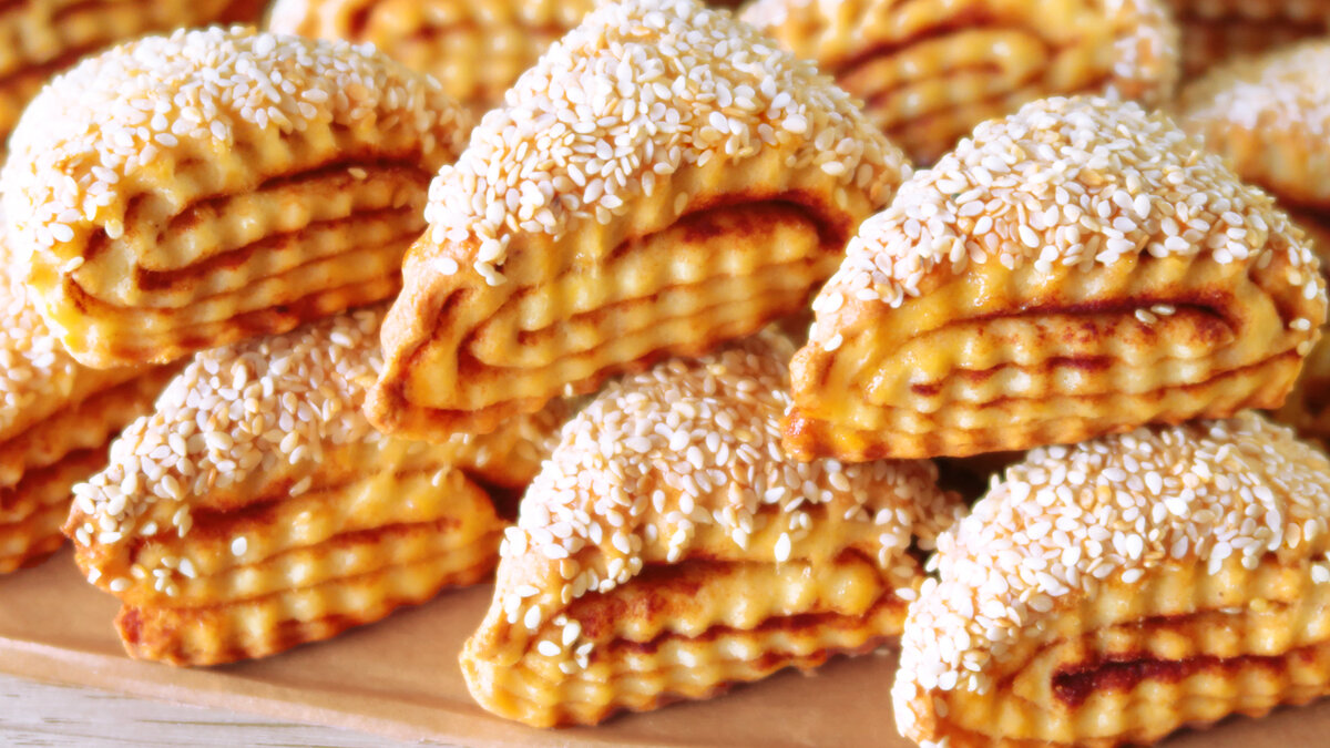 5. Затем нарежьте рулет на небольшие треугольники, смазывая желтком, разбавленным молоком. Обваляйте каждую порцию в кунжуте и выложите на противень.
