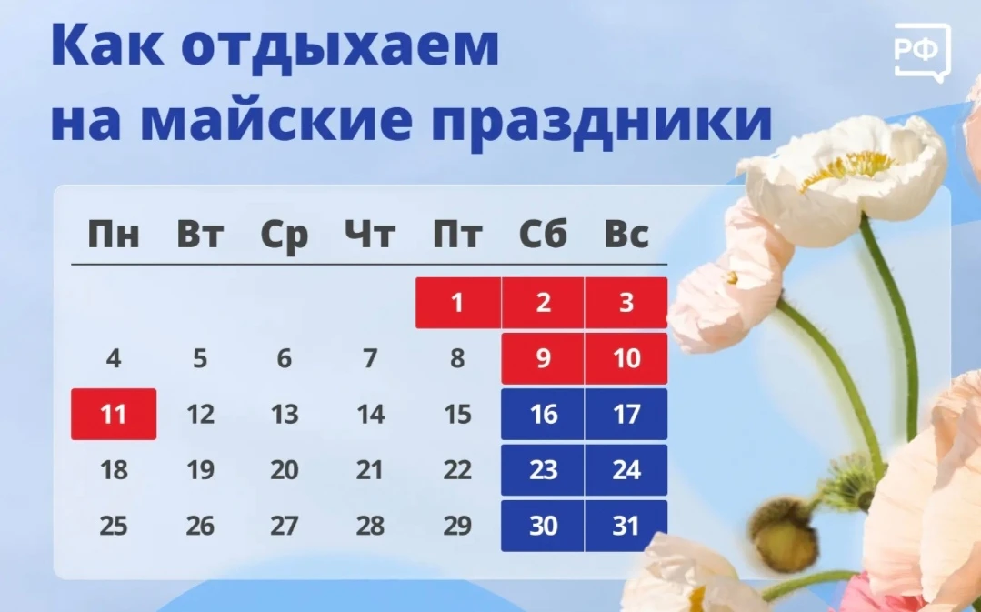 Следующая рабочая неделя будет полноценной, а затем нас ждут ещё три дня отдыха — 9, 10 и 11 мая в честь Дня Победы. Из-за того что 9 мая выпадает на субботу, дополнительный выходной перенесли на понедельник.