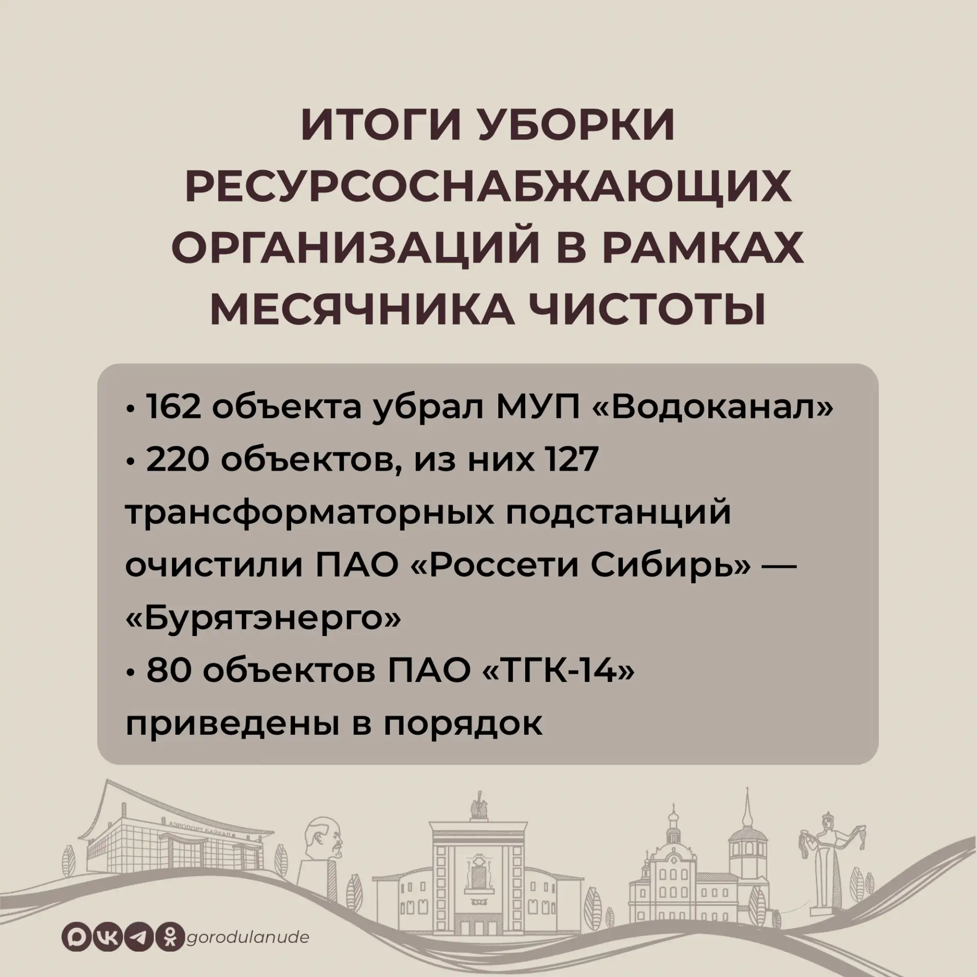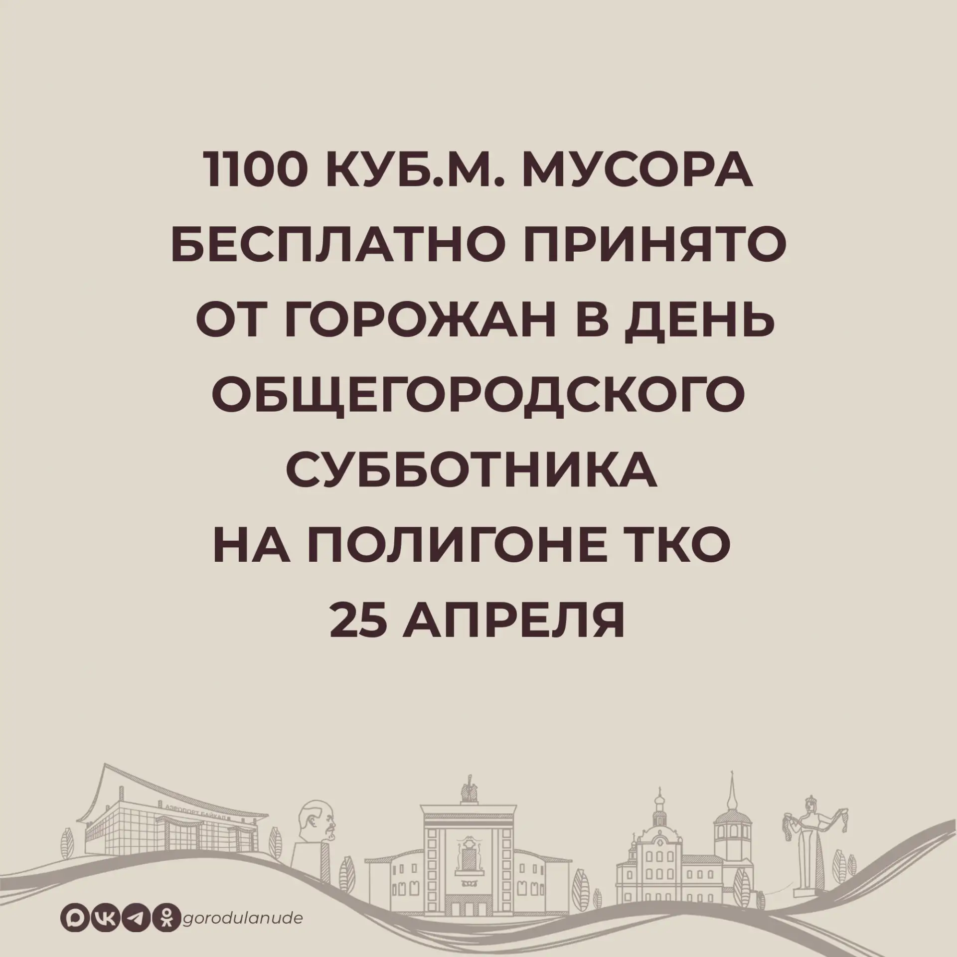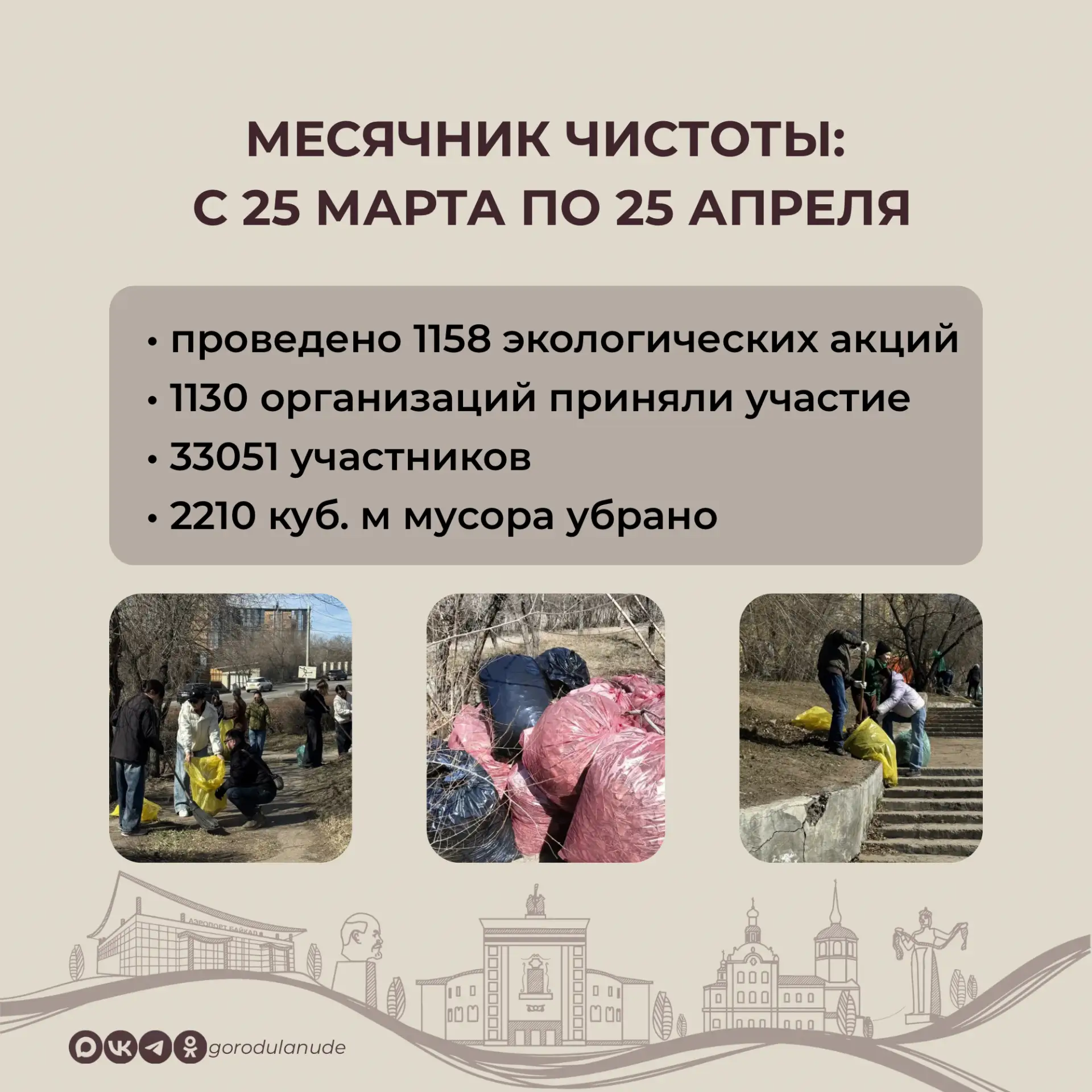 В месячник чистоты в Улан-Удэ с 25 марта по 25 апреля проведено 1158 экологических акций, в которых приняли участие 1130 организаций и более 33 тысяч человек, убрано 2210 куб.м мусора. В день общегородского субботника, 25 мая, на полигоне ТКО бесплатно от горожан принято 1100 куб.м отходов. Сейчас Комбинат по благоустройству вывозит мешки с мусором с общественных территорий.