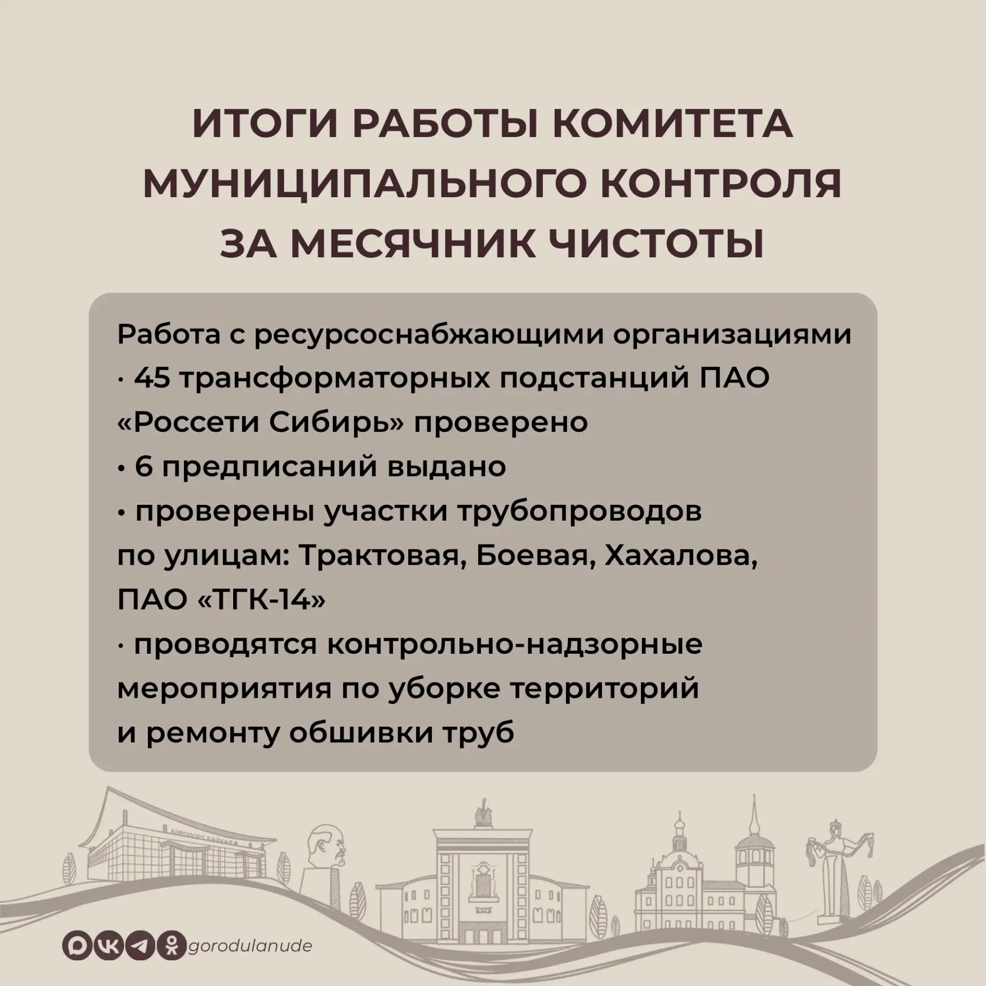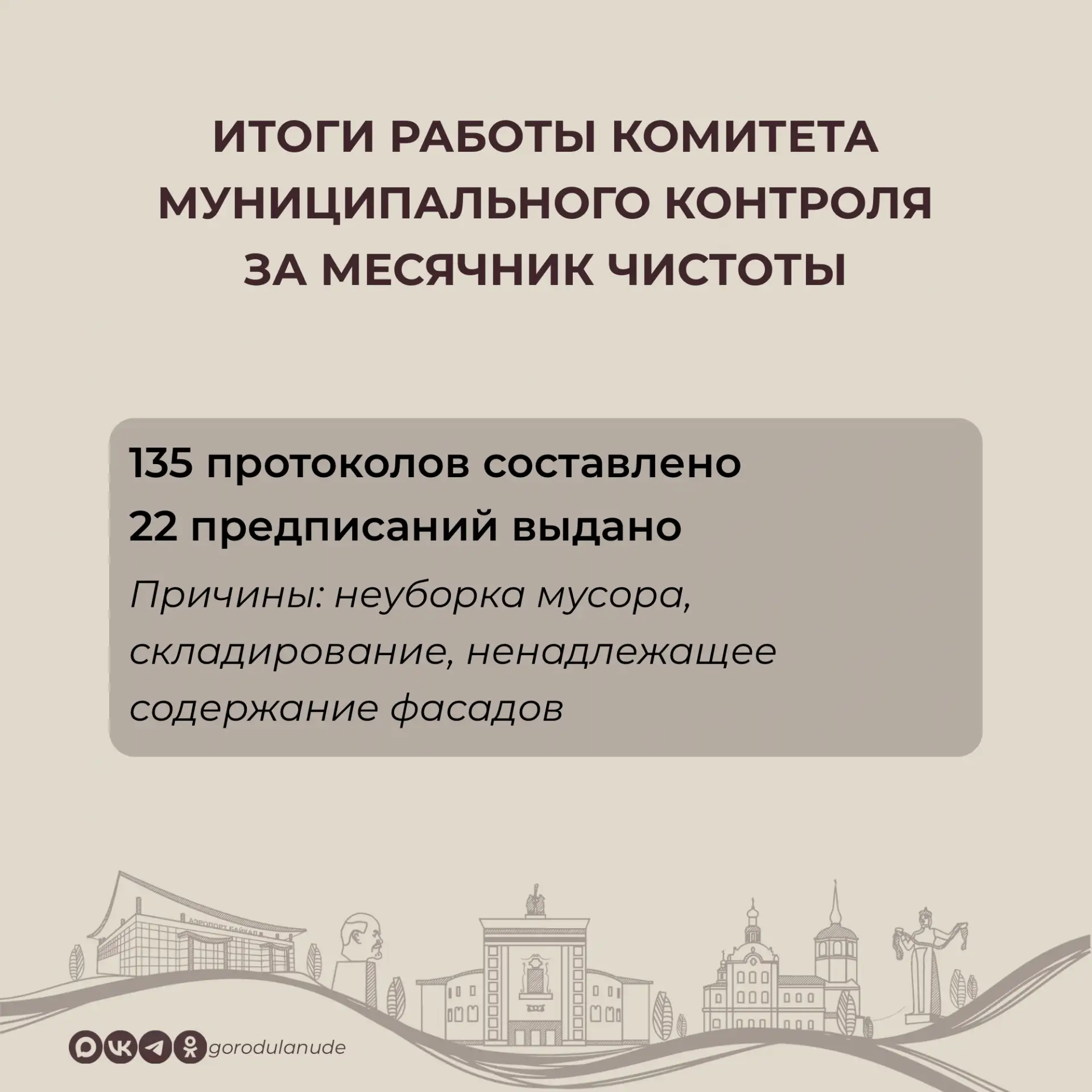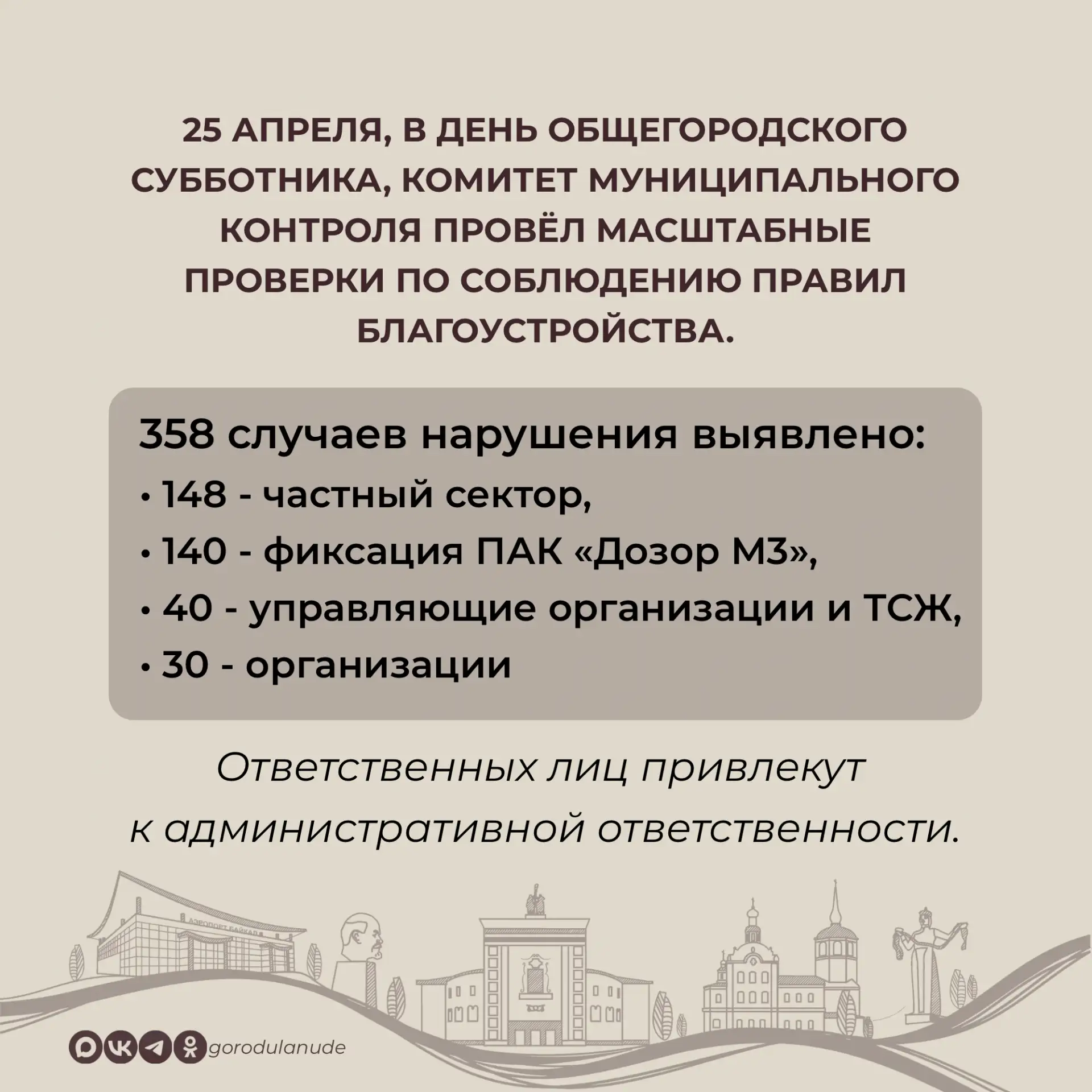В месячник чистоты в Улан-Удэ с 25 марта по 25 апреля проведено 1158 экологических акций, в которых приняли участие 1130 организаций и более 33 тысяч человек, убрано 2210 куб.м мусора. В день общегородского субботника, 25 мая, на полигоне ТКО бесплатно от горожан принято 1100 куб.м отходов. Сейчас Комбинат по благоустройству вывозит мешки с мусором с общественных территорий.