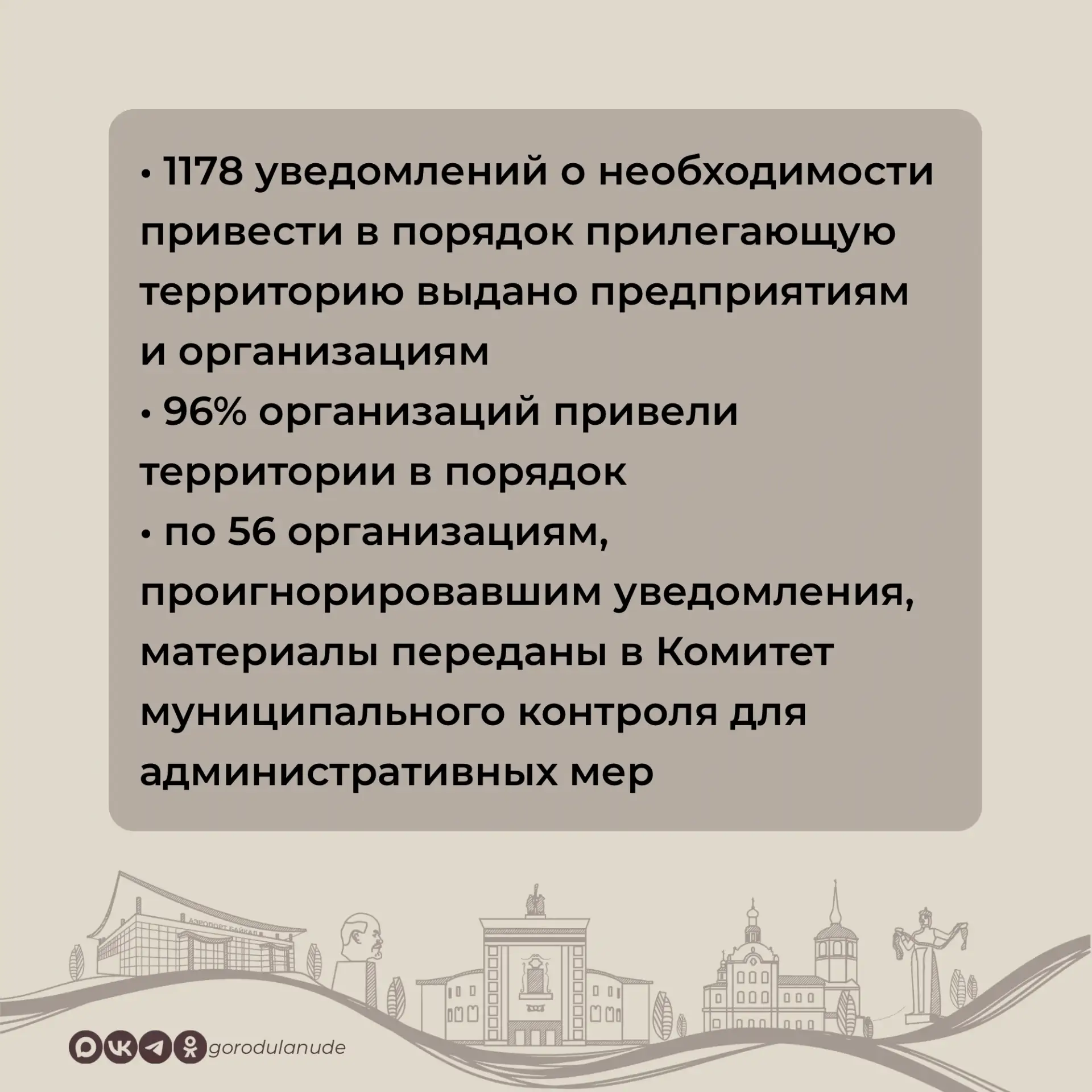 В период месячника предприятиям и организациям выдано 1178 уведомлений о необходимости привести в порядок прилегающую территорию, 96 процентов организаций привели территории в порядок.