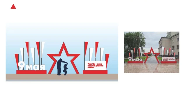 на Театральной площади — объёмнофлаговая конструкция «Арка Звезда» и объёмнодекоративная конструкция с надписью «1941–1945 Помним!», а также объёмная конструкция «9 мая»;