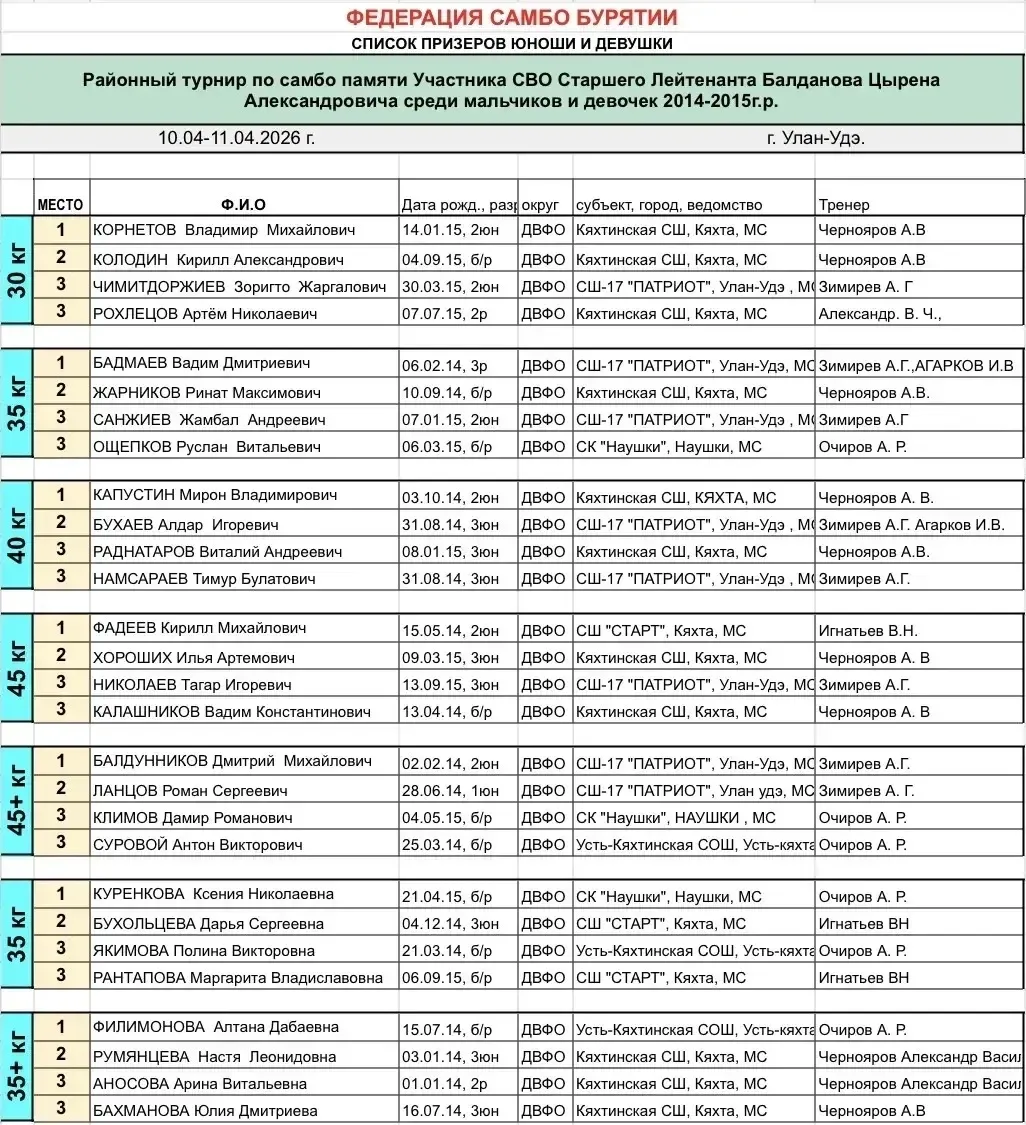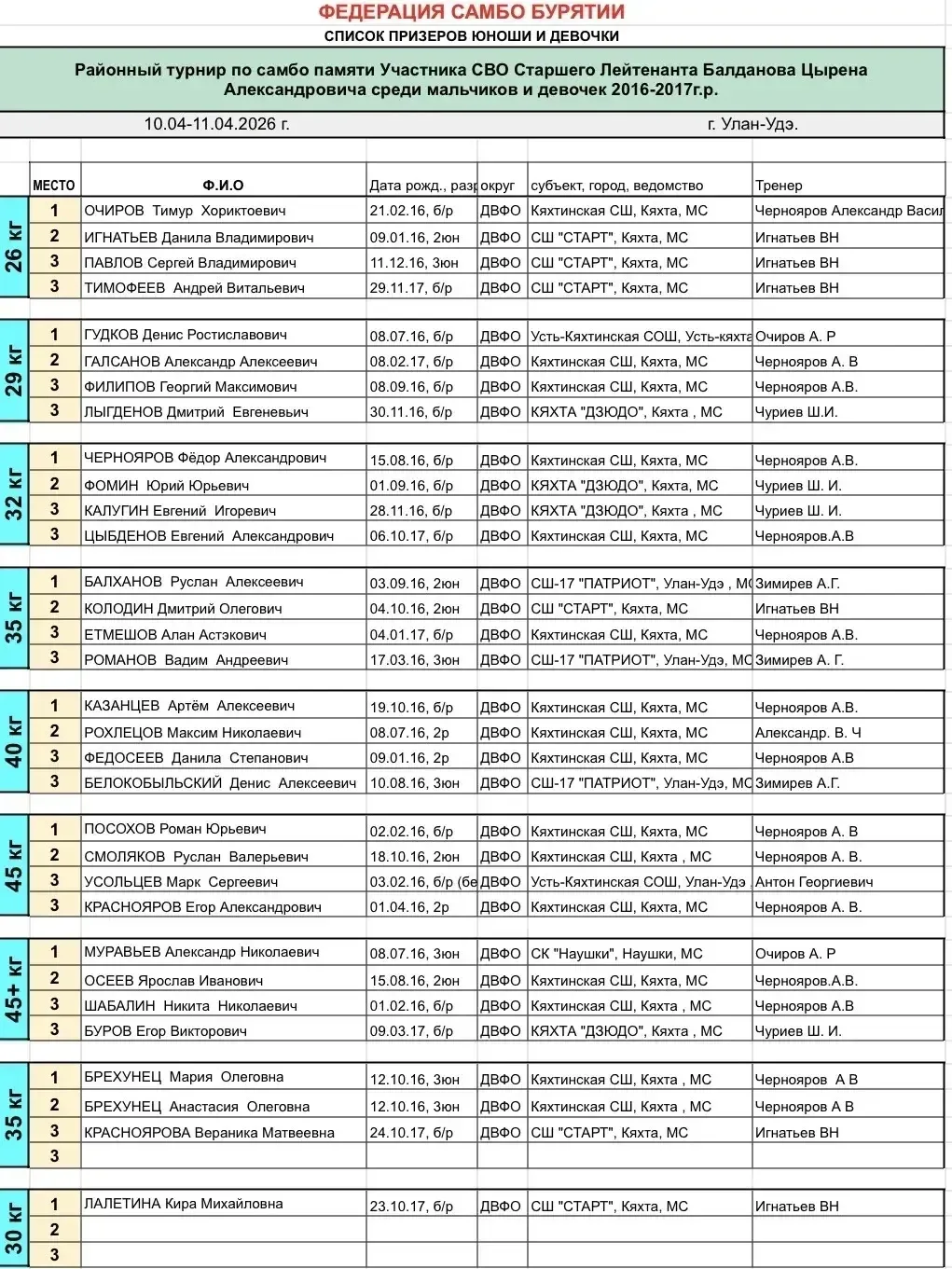 В Кяхтинском районе во второй раз прошли соревнования по самбо, посвящённые памяти участника СВО, старшего лейтенанта Цырена Балданова. Турнир объединил более 100 юношей и девушек
