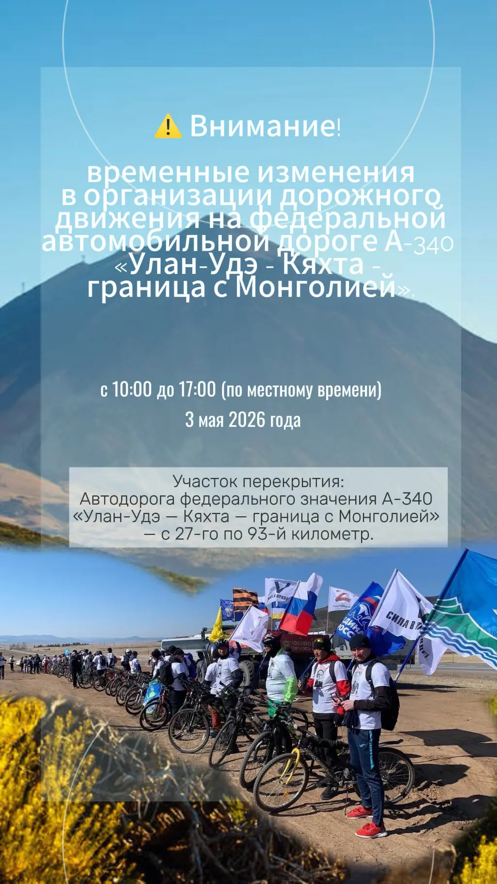 В связи с проведением республиканского велопробега в рамках всероссийской патриотической акции «Километры Победы», посвящённого 81-й годовщине Победы в Великой Отечественной войне, вводятся временные изменения в организации дорожного движения на федеральной автомобильной дороге А-340 «Улан-Удэ — Кяхта — граница с Монголией».